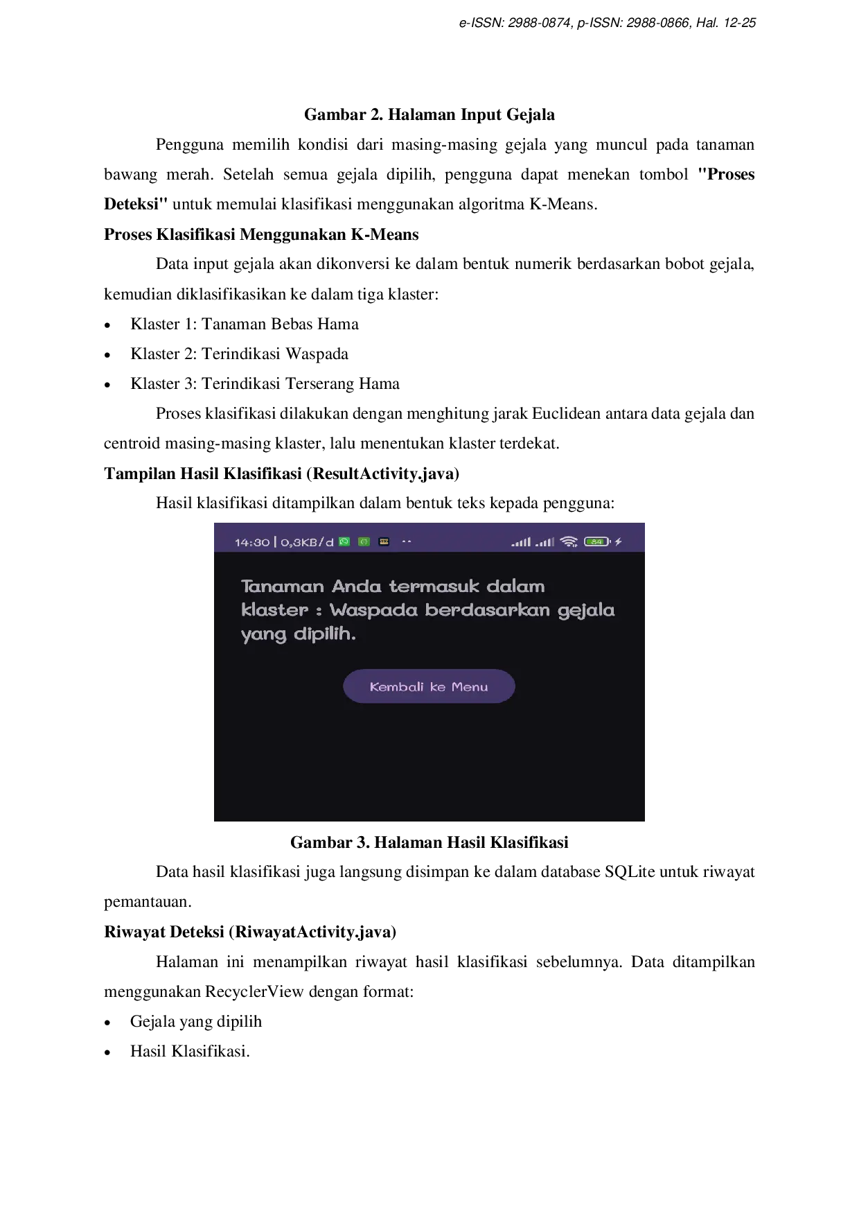 Aplikasi ini berhasil memproses gejala tanaman bawang merah dan mengelompokkannya menjadi tiga klaster menggunakan algoritma K-Means.Algoritma K-Means telah terimplementasi dengan benar, ditunjukkan dengan perhitungan jarak Euclidean yang akurat.Penyimpanan data dan tampilan riwayat deteksi berfungsi dengan baik, memungkinkan pengguna memantau kondisi tanaman secara berkala.