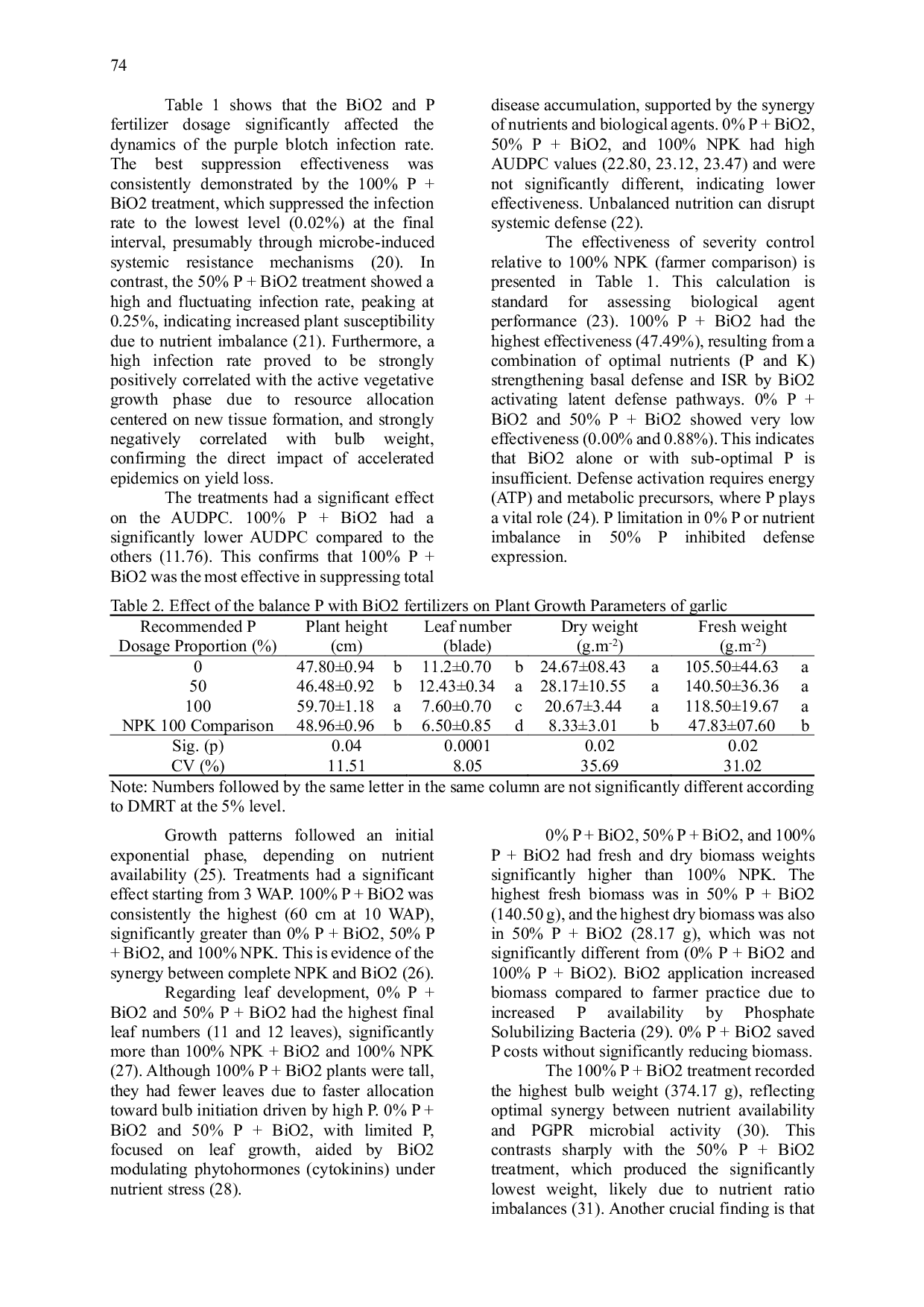 Penelitian lebih lanjut perlu dilakukan untuk menguji efektivitas BiO2 dalam kombinasi dengan berbagai jenis pupuk fosfat lainnya, termasuk sumber fosfat organik, untuk mengoptimalkan pemanfaatan nutrisi dan mengurangi ketergantungan pada pupuk anorganik. Selain itu, studi mendalam mengenai mekanisme interaksi antara BiO2 dan tanaman bawang putih, khususnya dalam menginduksi ketahanan terhadap penyakit purple blotch, dapat membuka peluang pengembangan biofertilizer yang lebih efektif dan spesifik. Terakhir, penelitian perlu diperluas untuk mengevaluasi dampak jangka panjang penggunaan BiO2 dan pupuk fosfat terhadap kesehatan tanah, keanekaragaman mikroba, serta kualitas lingkungan secara keseluruhan, guna memastikan keberlanjutan praktik pertanian bawang putih di lahan Andisol.