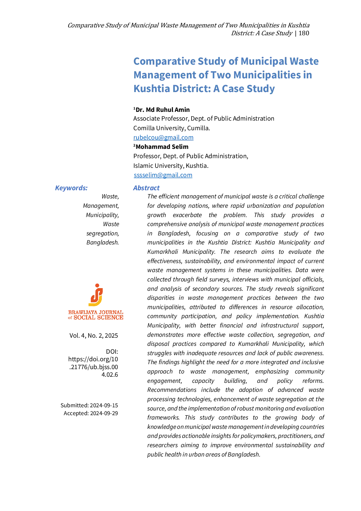 Brawijaya Journal of Social ScienceBrawijaya Journal of Social SciencePengelolaan sampah kota yang efisien merupakan tantangan kritis bagi negara-negara berkembang, di mana urbanisasi cepat dan pertumbuhan populasi memperparah permasalahan. Penelitian ini memberikan analisis komprehensif terhadap praktik pengelolaan sampah kota di Bangladesh, khususnya di dua kota kabupaten di Distrik Kushtia: Kota Kushtia dan Kota Kumarkhali. Tujuan penelitian adalah mengevaluasi efektivitas, keberlanjutan, dan dampak lingkungan dari sistem pengelolaan sampah yang ada di kedua kota tersebut. Data dikumpulkan melalui survei lapangan, wawancara dengan pejabat kota, dan analisis sumber sekunder. Hasil menunjukkan adanya perbedaan signifikan dalam praktik pengelolaan sampah antara kedua kota, yang disebabkan oleh perbedaan dalam alokasi sumber daya, partisipasi masyarakat, dan implementasi kebijakan. Kota Kushtia, yang memiliki dukungan finansial dan infrastruktur lebih baik, menunjukkan praktik pengumpulan, pemilahan, dan pembuangan sampah yang lebih efektif dibandingkan Kota Kumarkhali, yang menghadapi keterbatasan sumber daya dan kurangnya kesadaran publik. Temuan ini menekankan perlunya pendekatan yang lebih terintegrasi dan inklusif terhadap pengelolaan sampah, dengan penekanan pada keterlibatan masyarakat, reformasi kebijakan, dan peningkatan kapasitas. Rekomendasi mencakup adopsi teknologi pengolahan sampah yang lebih maju, peningkatan pemilahan sampah dari sumber, serta penerapan kerangka kerja pemantauan dan evaluasi yang kuat. Penelitian ini memberikan wawasan yang dapat ditindaklanjuti bagi pembuat kebijakan, praktisi, dan peneliti yang berupaya meningkatkan keberlanjutan lingkungan dan kesehatan masyarakat di wilayah urban Bangladesh.