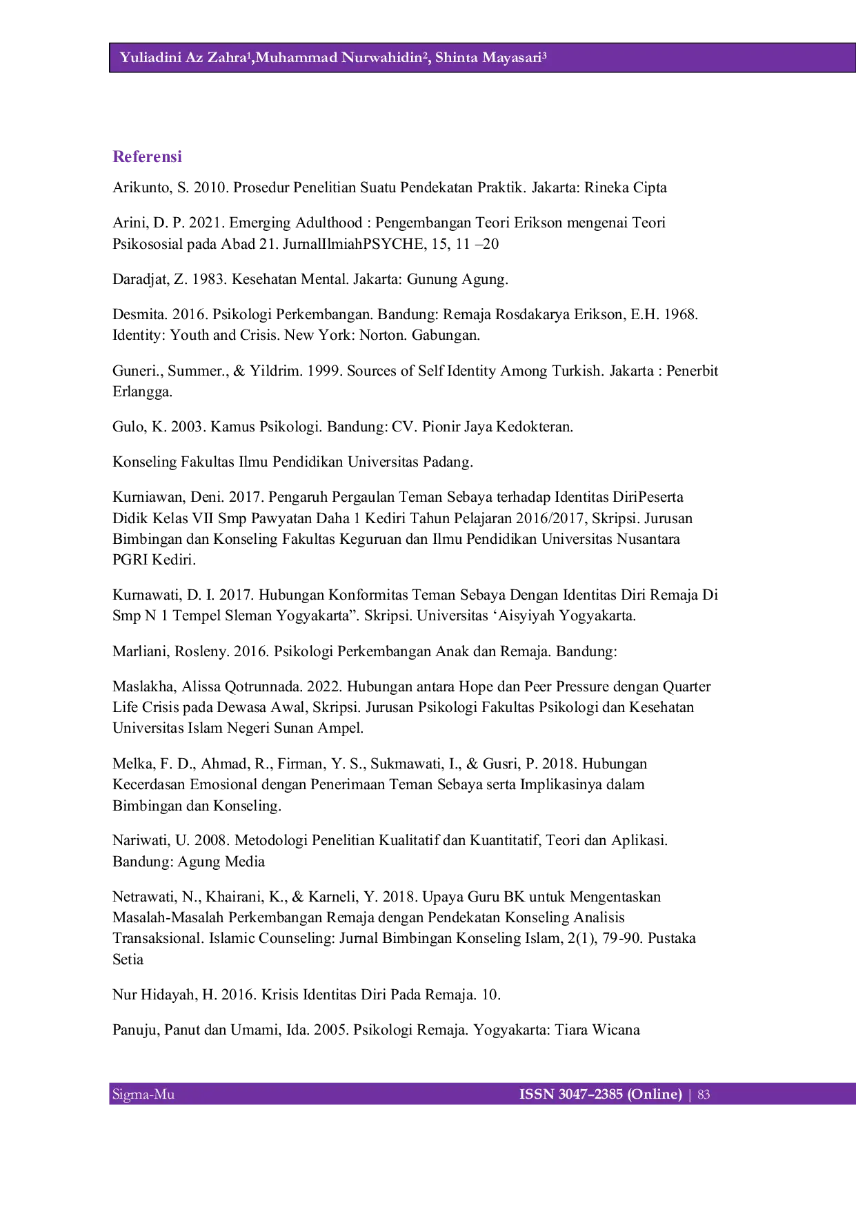 Sigma-MuSigma-MuMasalah dalam penelitian ini adalah self identity yang rendah pada siswa karena pengaruh peer pressure. Penelitian ini bertujuan untuk mengetahui hubungan peer pressure dengan self identity pada siswa SMA Negeri 1 Kalianda tahun pelajaran 2023/2024. Metode penelitian yang digunakan yaitu pendekatan korelasional. Populasi penelitian ini sebanyak 409 siswa dengan sampel sebanyak 105 siswa yang diambil dengan menggunakan teknik cluster random sampling. Teknik analisis data menggunakan Korelasi Product Moment. Pengumpulan data menggunakan Skala Peer Pressure dan Self Identity. Hasil penelitian menunjukkan terdapat hubungan positif antara peer pressure dengan self identity siswa yang ditunjukkan dengan indeks korelasi rhitung = 0,340 > rtabel 0,192 pada taraf sig p = 0,001 < 0,05 maka H0 ditolak dan Ha diterima menunjukkan bahwa hasil dari penelitian ini terdapat hubungan yang berarah positif antara peer pressure dengan self identity pada siswa SMA Negeri 1 Kalianda. Hal ini berarti jika peer pressure semakin tinggi maka akan semakin kuat identitas diri pada siswa, begitupun sebaliknya, semakin rendah peer pressure maka akan semakin rendah pula self identity.