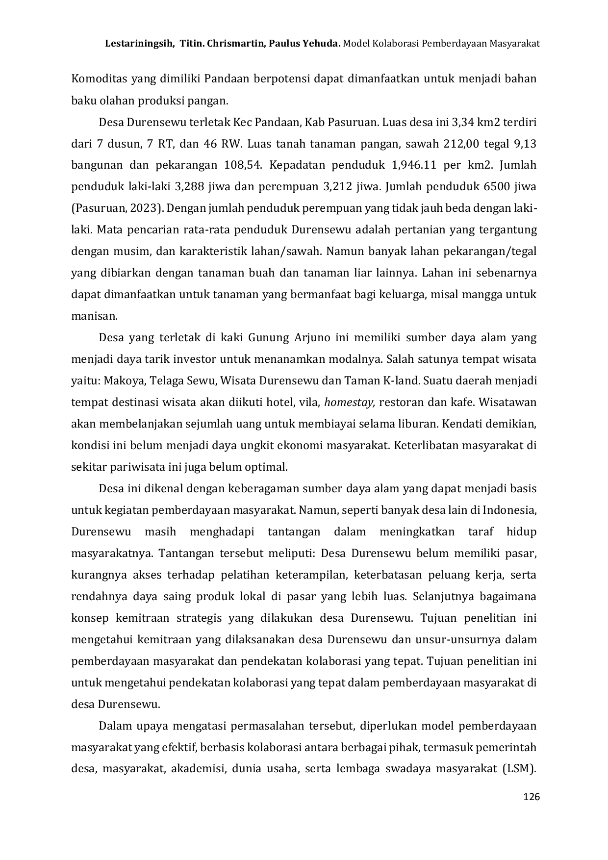 Jurnal Intervensi Sosial dan Pembangunan (JISP)Jurnal Intervensi Sosial dan Pembangunan (JISP)Pemberdayaan masyarakat menjadi salah satu pendekatan penting dalam upaya peningkatan taraf hidup, terutama di kawasan pedesaan. Penelitian ini bertujuan untuk merancang dan menganalisis efektivitas model kolaborasi pemberdayaan masyarakat berbasis pengolahan pangan di Desa Durensewu. Model ini mengintegrasikan peran masyarakat lokal, pemerintah, dan stakeholder terkait untuk menciptakan ekosistem agribisnis yang mandiri dan berkelanjutan. Hasil penelitian menunjukkan bahwa kolaborasi yang efektif mampu meningkatkan kapasitas masyarakat dalam mengolah hasil pertanian menjadi produk pangan bernilai tambah. Selain itu, model ini juga membuka peluang pasar yang lebih luas, menciptakan lapangan kerja baru, dan meningkatkan pendapatan masyarakat. Penelitian ini menegaskan bahwa pengolahan pangan berbasis kolaborasi dapat menjadi solusi inovatif untuk meningkatkan kesejahteraan masyarakat pedesaan.