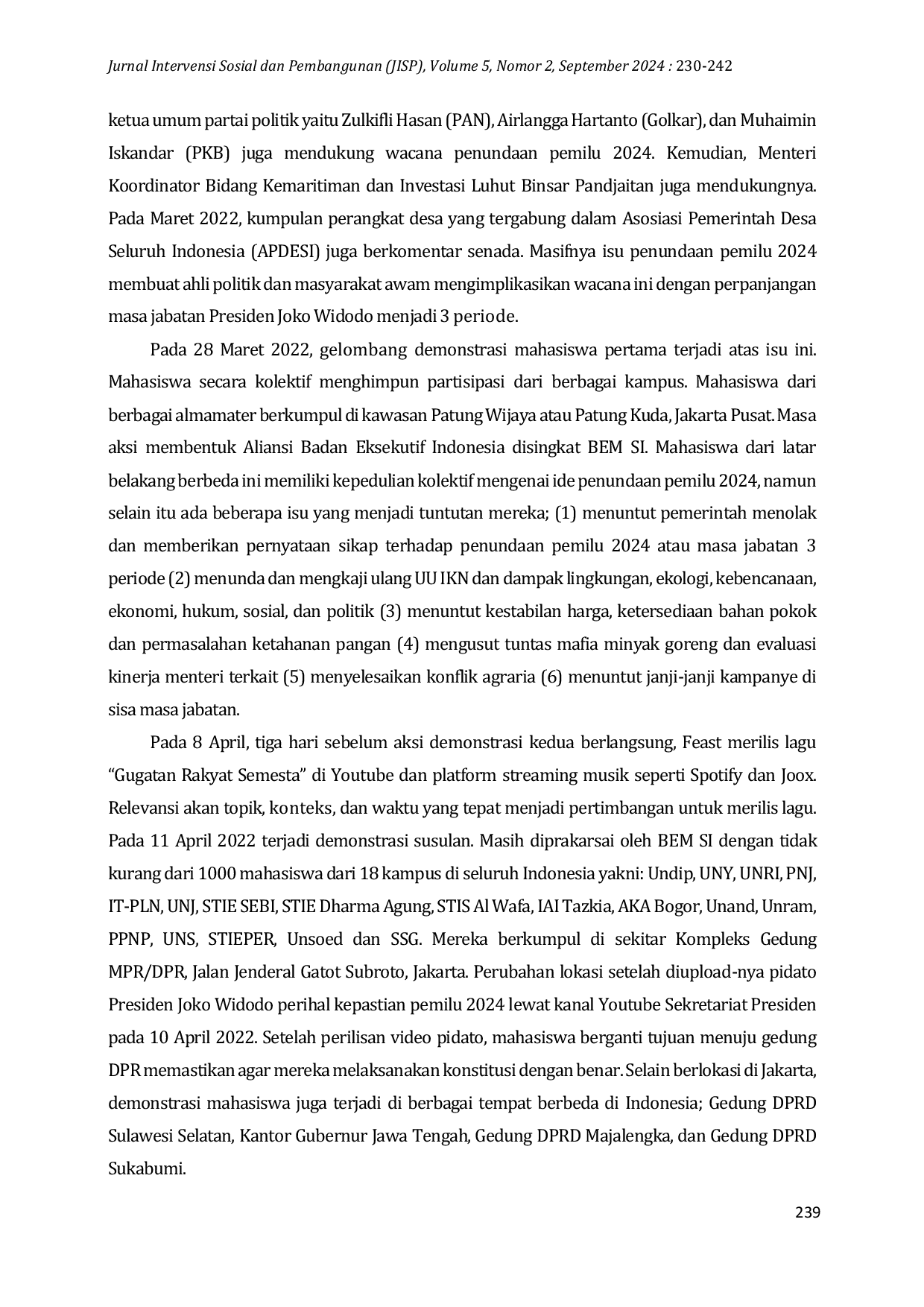 Jurnal Intervensi Sosial dan Pembangunan (JISP)Jurnal Intervensi Sosial dan Pembangunan (JISP)Penelitian ini bertujuan untuk menganalisis makna sebuah lagu sebagai alat kritik, dengan fokus pada lagu Gugatan Rakyat Semesta yang mengajak masyarakat untuk mengkritisi pemerintahan. Penelitian ini menggunakan metode kualitatif deskriptif dengan pendekatan analisis wacana kritis Norman Fairclough, yang mencakup tiga dimensi analisis: tekstual, diskursif, dan sosiokultural. Secara tekstual, elemen bahasa seperti struktur kalimat, kohesi, koherensi, dan kata kunci dianalisis untuk melihat bagaimana bahasa digunakan tidak hanya sebagai alat komunikasi, tetapi juga sebagai instrumen untuk menentang kekuasaan dan ideologi. Pada dimensi diskursif, proses produksi lagu oleh Feast dan penerimaannya oleh publik dikaji, terutama dalam konteks demonstrasi mahasiswa di Indonesia pada tahun 2022. Sementara itu, dimensi sosiokultural menelaah kondisi sosial-politik yang lebih luas yang melatarbelakangi terciptanya lagu ini, termasuk kebijakan pemerintah yang merugikan masyarakat. Hasil penelitian menunjukkan bahwa: (1) Secara tekstual, lagu ini berisi ajakan kepada masyarakat untuk menggulingkan pemerintah yang dinilai merugikan; (2) Secara diskursif, produksi dan perilisian lagu terkait erat dengan aksi demonstrasi mahasiswa, dan konsumsi publik menunjukkan dukungan terhadap aksi tersebut; (3) Secara sosiokultural, lagu ini muncul dari ketidakpuasan terhadap kebijakan pemerintah yang dianggap merugikan negara dan masyarakat. Penelitian ini diharapkan dapat memberikan kontribusi dalam memahami bagaimana karya seni musik, khususnya lagu, dapat berperan sebagai alat kritik dalam konteks sosial-politik.