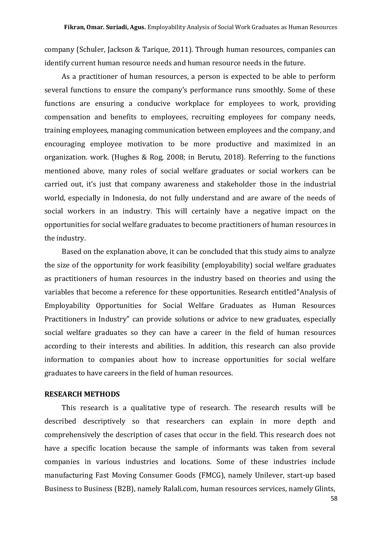 Jurnal Intervensi Sosial dan Pembangunan (JISP)Jurnal Intervensi Sosial dan Pembangunan (JISP)Penelitian ini bertujuan untuk menentukan apakah seorang lulusan pekerjaan sosial memiliki peluang besar atau kecil untuk menjadi praktisi sumber daya manusia di industri. Penelitian ini bersifat kualitatif dan menggunakan teknik pengumpulan data melalui studi pustaka, penelitian berbasis internet, serta studi lapangan yang mencakup wawancara dan observasi dengan praktisi sumber daya manusia dari Ralali.com, Unilever Indonesia, Glints Indonesia, dan TikTok (Bytedance) Indonesia. Berdasarkan hasil penelitian, penulis menyimpulkan bahwa peluang lulusan pekerjaan sosial untuk menjadi praktisi sumber daya manusia di industri memang ada. Dalam pembahasan, faktor-faktor yang mempengaruhi besarnya peluang tersebut adalah: pertama, pandangan praktisi sumber daya manusia di industri terhadap lulusan pekerjaan sosial masih belum optimal, tetapi ketika praktisi sudah mengetahui secara detail tentang pekerjaan sosial dan lulusannya, praktisi cenderung percaya pada keterampilan yang dimiliki oleh lulusan pekerjaan sosial. Kedua, hal ini menunjukkan bagaimana industri sebenarnya cukup terbuka untuk merekrut lulusan dari berbagai latar belakang pendidikan untuk posisi sumber daya manusia selama lulusan tersebut memiliki kompetensi yang dibutuhkan oleh industri meskipun tingkat persaingan pasar untuk posisi sumber daya manusia cukup kompetitif.
