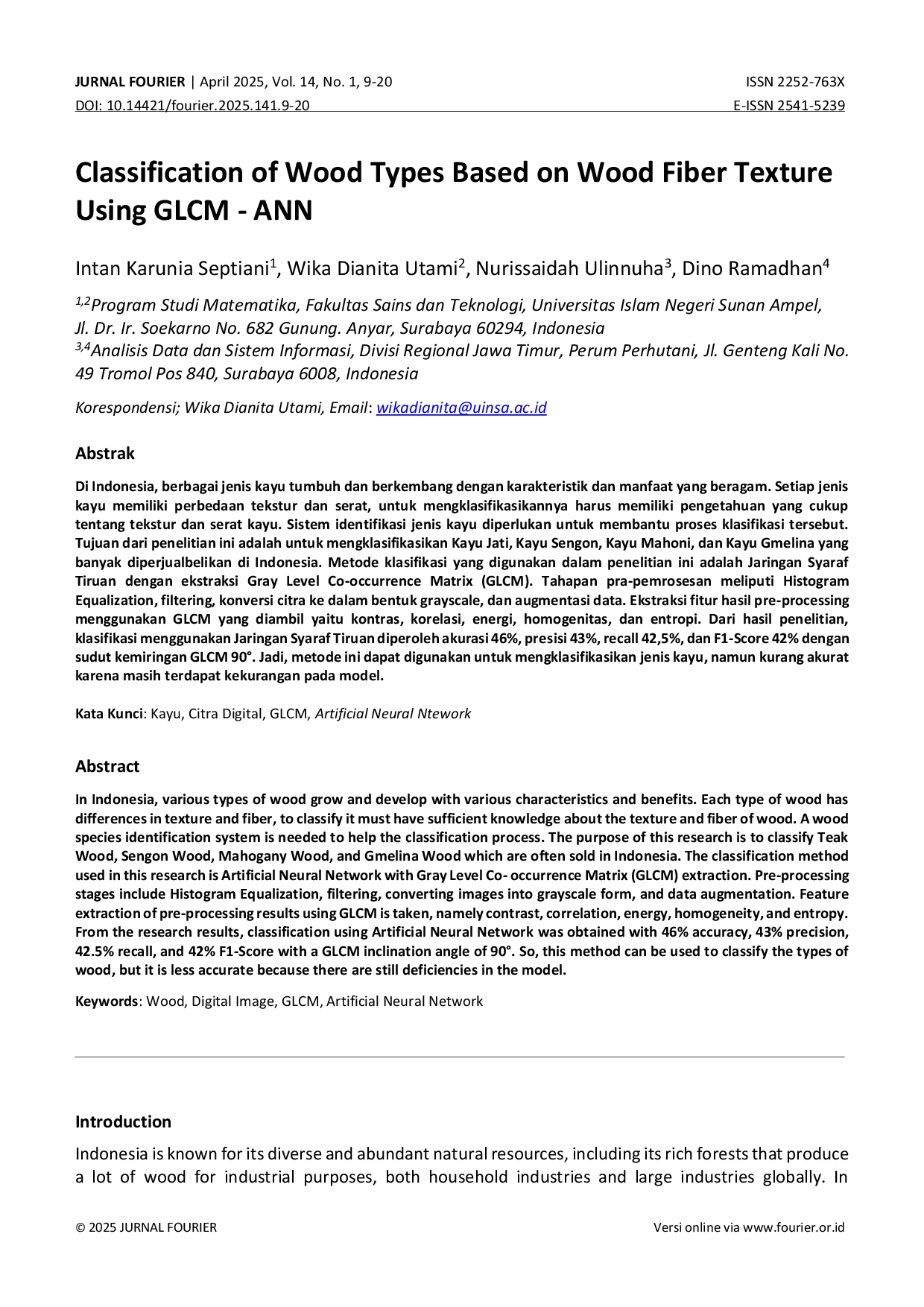 Jurnal FourierJurnal FourierDi Indonesia, berbagai jenis kayu tumbuh dan berkembang dengan karakteristik dan manfaat yang beragam. Setiap jenis kayu memiliki perbedaan tekstur dan serat, untuk mengklasifikasikannya harus memiliki pengetahuan yang cukup tentang tekstur dan serat kayu. Sistem identifikasi jenis kayu diperlukan untuk membantu proses klasifikasi tersebut. Tujuan dari penelitian ini adalah untuk mengklasifikasikan Kayu Jati, Kayu Sengon, Kayu Mahoni, dan Kayu Gmelina yang banyak diperjualbelikan di Indonesia. Metode klasifikasi yang digunakan dalam penelitian ini adalah Jaringan Syaraf Tiruan dengan ekstraksi Gray Level Co-occurrence Matrix (GLCM). Tahapan pra-pemrosesan meliputi Histogram Equalization, filtering, konversi citra ke dalam bentuk grayscale, dan augmentasi data. Ekstraksi fitur hasil pre-processing menggunakan GLCM yang diambil yaitu kontras, korelasi, energi, homogenitas, dan entropi. Dari hasil penelitian, klasifikasi menggunakan Jaringan Syaraf Tiruan diperoleh akurasi 46%, presisi 43%, recall 42,5%, dan F1-Score 42% dengan sudut kemiringan GLCM 90°. Jadi, metode ini dapat digunakan untuk mengklasifikasikan jenis kayu, namun kurang akurat karena masih terdapat kekurangan pada model.