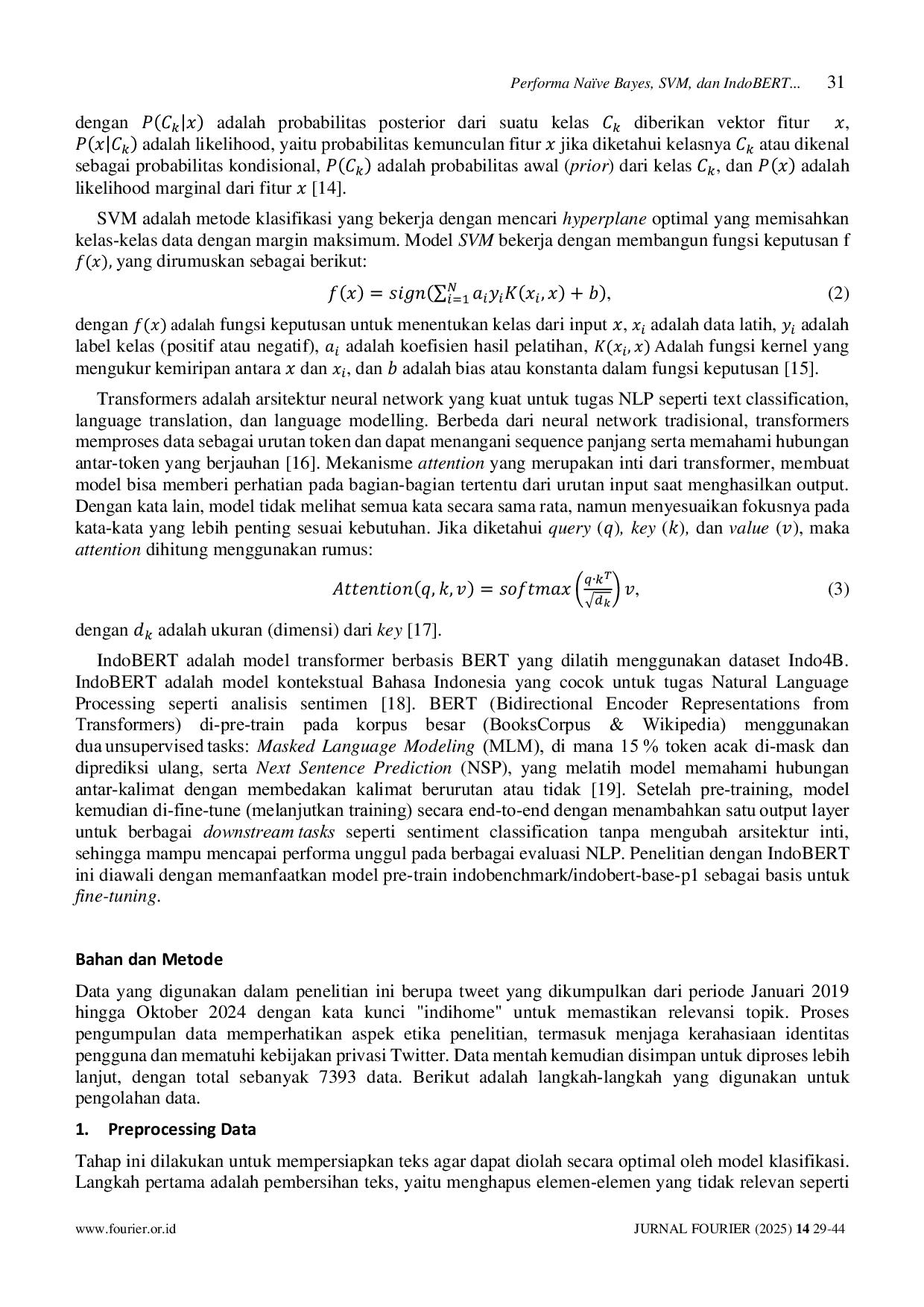 Jurnal FourierJurnal FourierPenelitian ini bertujuan untuk membandingkan performa tiga pendekatan analisis sentimen, yaitu Naïve Bayes, Support Vector Machine (SVM), dan Indonesian Bidirectional Encoder Representations from Transformers (IndoBERT), pada layanan IndiHome menggunakan data Twitter. Keterbatasan model tradisional melatarbelakangi penelitian ini dalam mengenali opini positif dan tantangan ketidakseimbangan data yang sering muncul dalam analisis berbasis media sosial. Data penelitian berupa 7393 tweet (Januari 2019–Agustus 2024) yang dilabeli secara manual menjadi sentimen positif dan negatif. Model dievaluasi menggunakan stratified 10-fold cross validation dan data uji, dengan penerapan teknik penanganan ketidakseimbangan berupa Synthetic Minority Oversampling Technique (SMOTE) dan pembobotan kelas (class weighting). Hasil menunjukkan IndoBERT unggul dengan akurasi 0,96 dan F1-score makro 0,95 tanpa penanganan khusus, sedangkan SVM mencapai akurasi 0,95 dengan pembobotan kelas, dan Naïve Bayes meningkat dari akurasi 0,89 menjadi 0,92 setelah SMOTE. Analisis tren sentimen menunjukkan opini negatif mendominasi, terutama terkait kecepatan dan kestabilan layanan. Temuan ini menegaskan bahwa IndoBERT lebih efektif dalam memahami konteks bahasa Indonesia, sementara teknik penanganan data tetap relevan untuk meningkatkan performa model tradisional. Hasil penelitian ini penting karena memberikan dasar empiris dalam pemilihan model analisis sentimen yang lebih akurat, adaptif terhadap bahasa Indonesia, dan bermanfaat dalam meningkatkan kualitas layanan.