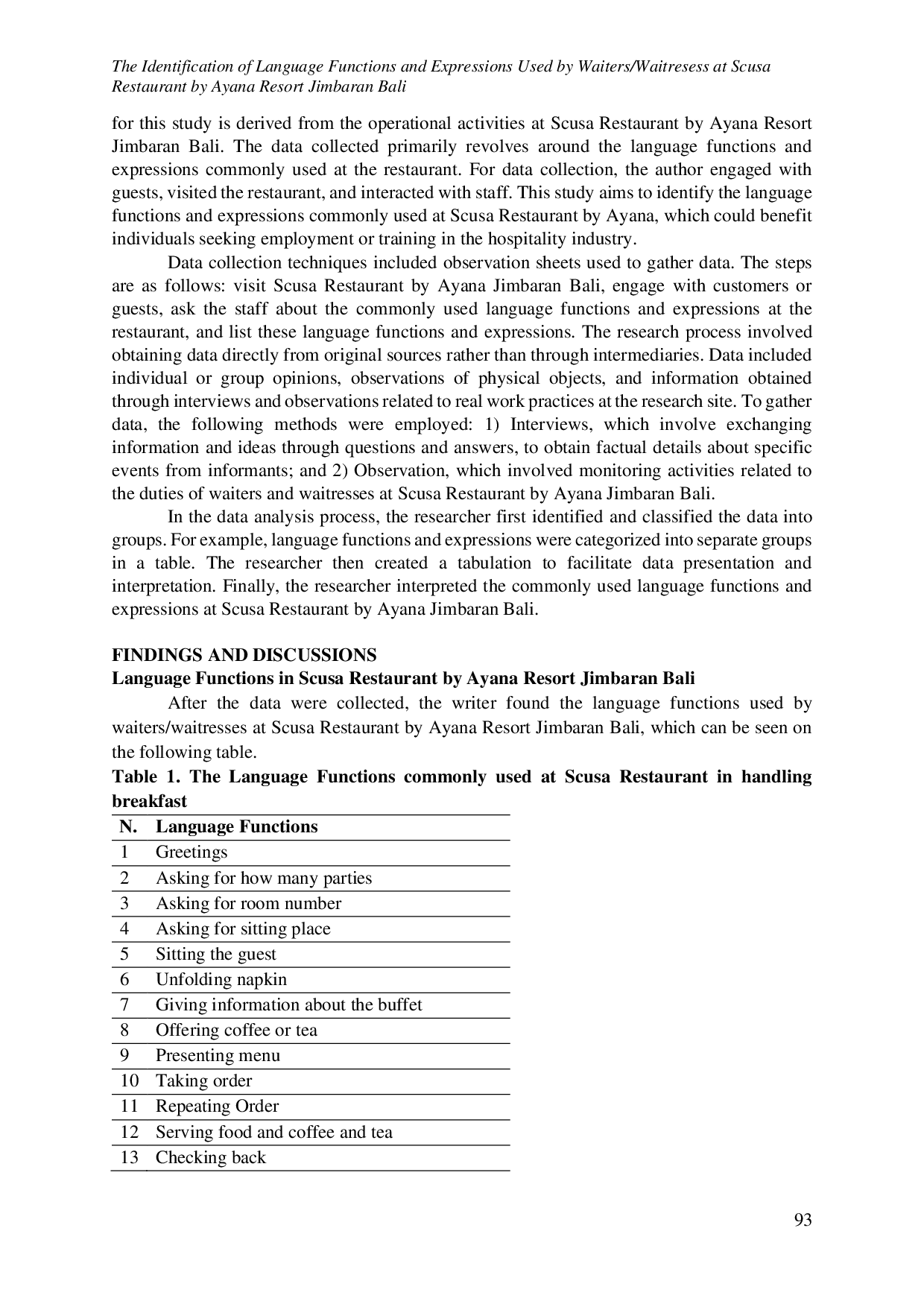 Journal of Linguistic and Literature StudiesJournal of Linguistic and Literature StudiesPenelitian ini bertujuan untuk mengkaji fungsi bahasa dan ekspresi bahasa yang digunakan di Restoran Scusa, yang berlokasi di Ayana Resort, Jimbaran, Bali. Melalui analisis kualitatif, penelitian ini mengeksplorasi bagaimana bahasa digunakan dalam berbagai aspek pengalaman sarapan, termasuk interaksi dengan pelanggan, penyajian menu, dan komunikasi layanan. Penelitian ini menggunakan observasi dan wawancara untuk memperoleh data. Observasi dan wawancara dilakukan terhadap subjek pada 13 Mei 2024 hingga 5 Juni 2024. Data dianalisis menggunakan teori fungsi bahasa dan ekspresi bahasa yang dikembangkan oleh Purnamaningsih (2020) dan Sardianti (2020). Penelitian ini menemukan total 16 fungsi bahasa dan 16 ekspresi bahasa yang umum digunakan oleh pelayan dalam melayani tamu selama sarapan. Fungsi bahasa meliputi menyapa, menanyakan jumlah tamu, menanyakan nomor kamar, menanyakan tempat duduk, mengantar tamu duduk, membentangkan serbet, memberi informasi tentang prasmanan, menawarkan kopi atau teh, menyajikan menu, mencatat pesanan, mengulang pesanan, menyajikan makanan atau kopi dan teh, mengecek kembali, menyelesaikan pembayaran, mengucapkan terima kasih kepada tamu, serta mengucapkan selamat menjalani hari. Setiap fungsi bahasa diekspresikan melalui berbagai ungkapan yang sesuai dengan situasi dan kondisi saat melayani tamu. Temuan menunjukkan penggunaan strategis bahasa untuk meningkatkan kepuasan pelanggan, mencerminkan nilai budaya, serta menjaga standar layanan keramahtamahan yang tinggi.