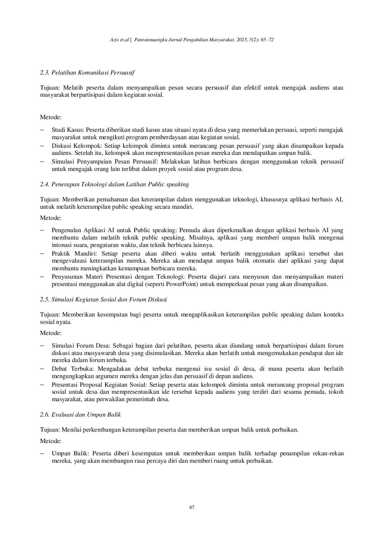 Pertama, perlu dilakukan penelitian tentang efektivitas aplikasi AI dalam membentuk kebiasaan latihan public speaking secara mandiri jangka panjang pada remaja di pedesaan, mengingat akses terbatas terhadap pelatih profesional. Kedua, perlu dikaji bagaimana integrasi pelatihan public speaking berbasis digital dengan konten keagamaan lokal dapat meningkatkan keterlibatan dan relevansi bagi remaja masjid di daerah lain dengan karakteristik serupa. Ketiga, penting untuk mengeksplorasi pengembangan komunitas pelatihan peer-to-peer yang didukung platform digital sederhana, sehingga keterampilan yang diperoleh dapat terus diasah secara berkelanjutan meskipun tanpa intervensi langsung dari fasilitator eksternal. Ketiga arah penelitian ini dapat membantu memperluas cakupan dan keberlanjutan program serupa di wilayah terpencil dengan sumber daya terbatas.