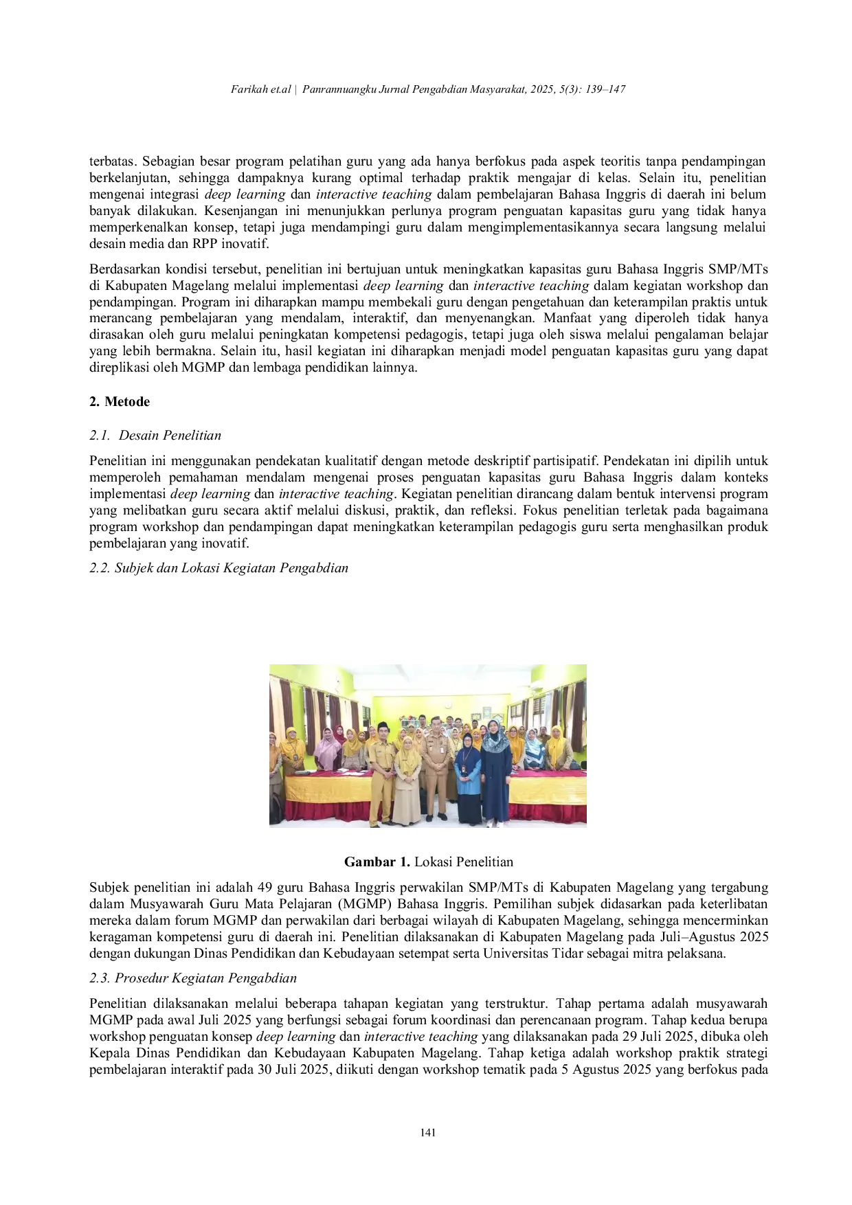 Panrannuangku Jurnal Pengabdian MasyarakatPanrannuangku Jurnal Pengabdian MasyarakatKualitas pengajaran bahasa Inggris di jenjang Sekolah Menengah Pertama (SMP/MTs) di Kabupaten Magelang masih menghadapi tantangan, terutama dalam penerapan metode yang mendorong keterlibatan siswa secara aktif sesuai dengan Kurikulum Merdeka. Program pengabdian masyarakat ini bertujuan untuk memperkuat kapasitas guru bahasa Inggris melalui penerapan pendekatan pembelajaran mendalam dan pengajaran interaktif. Program ini dilaksanakan bekerja sama dengan MGMP Bahasa Inggris dan melibatkan serangkaian lokakarya berjenjang—pengenalan konsep, praktik merancang strategi interaktif, pengembangan media pembelajaran yang menyenangkan, dan pendampingan penyusunan rencana pembelajaran (RPP). Sebanyak 49 guru bahasa Inggris berpartisipasi aktif dalam program ini. Hasilnya menunjukkan peningkatan yang signifikan dalam pemahaman guru tentang prinsip-prinsip pembelajaran mendalam, kemampuan mereka merancang media pembelajaran kreatif tingkat A1, dan kompetensi mereka dalam menghasilkan rencana pembelajaran inovatif yang selaras dengan praktik pengajaran interaktif. Hasil ini menyoroti efektivitas pendampingan berbasis praktik dan lokakarya kolaboratif dalam meningkatkan kapasitas pedagogis. Studi ini menyimpulkan bahwa dukungan sistematis dan kolaborasi berkelanjutan sangat penting untuk mendorong pembelajaran bahasa Inggris yang inovatif dan berpusat pada siswa di sekolah menengah.