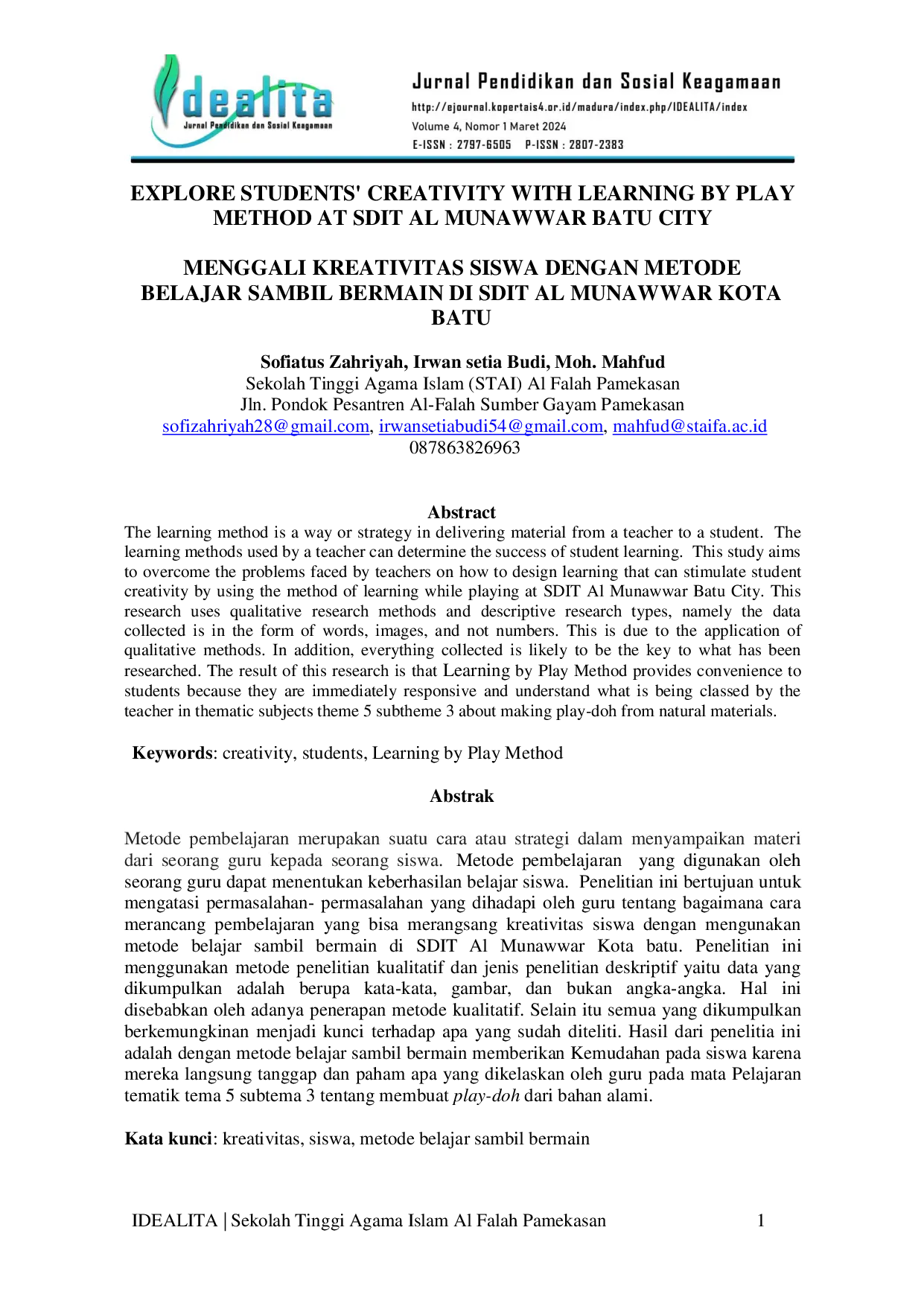 IDEALITA: Jurnal Pendidikan dan Sosial KeagamaanIDEALITA: Jurnal Pendidikan dan Sosial KeagamaanThe learning method is a way or strategy in delivering material from a teacher to a student. The learning methods used by a teacher can determine the success of student learning. This study aims to overcome the problems faced by teachers on how to design learning that can stimulate student creativity by using the method of learning while playing at SDIT Al Munawwar Batu City. This research uses qualitative research methods and descriptive research types, namely the data collected is in the form of words, images, and not numbers. This is due to the application of qualitative methods. In addition, everything collected is likely to be the key to what has been researched. The result of this research is that Learning by Play Method provides convenience to students because they are immediately responsive and understand what is being classed by the teacher in thematic subjects theme 5 subtheme 3 about making play-doh from natural materials.