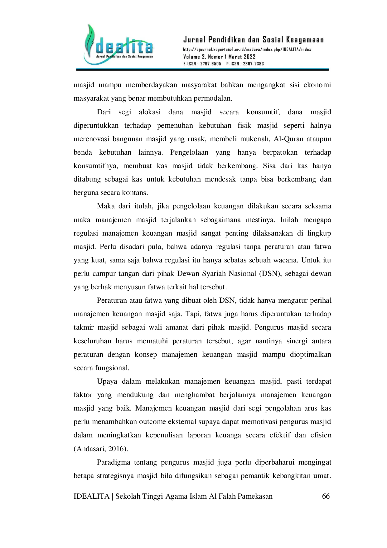 IDEALITA: Jurnal Pendidikan dan Sosial KeagamaanIDEALITA: Jurnal Pendidikan dan Sosial KeagamaanPenelitian ini bertujuan untuk mengetahui perputaran dana hibah masjid dapat dipergunakan untuk meningkatkan perekonomian masyarakat muslim pada khususnya di masjid Darul Falah Desa Bungbaruh Kecamatan Kadur Kabupaten Pamekasan Madura. Maka alokasi dana hibah masjid Darul Falah Desa Bungbaruh Kecamatan Kadur Kabupaten Pamekasan harus segera disalurkan supaya memperkuat landasan pengelolaan lembaga keuangan untuk kesejahteraan masjid dan Masyarakat Muslim khususnya. Penelitian ini jenis penelitian kualitatif deskriptif, dimana peneliti mengamati, dan menganilisa data yang ada didalam pengelolaannya. Apalagi Peran masjid menurut dalam kitab Al-Quran dan As-Sunnah menjelaskan bahwa masjid bisa dioptimalkan sebagai tempat pemberdayaan masyarakat baik dari segi ekonomi, sosial, budaya dan sebagainya. Permasalahan yang timbul dalam lembaga pengelolaan dana masjid masih sangat tidak signifikan dan belum efektif. Dimana masih banyaknya penggunaan dana masjid hanya untuk kebutuhan Prasarana masjid tanpa dikembangkan untuk pemberdayaan umat. Dana masjid harus dibagi menjadi dua alokasi dana, yakni dana produktif dan konsumtif. Pengalokasian dana tersebut bertujuan agar perputaran kas masjid mampu dipergunakan untuk meningkatkan perekonomian ummat.Untuk mengalokasi dana masjid harus betul-betul memahami tatakelola keuangan yang mampu mengembangkan khas Masjid dan mampu bisa dirasakan oleh masyarat dalam menunjang keterpurukan ekonomi di masyakat muslim.