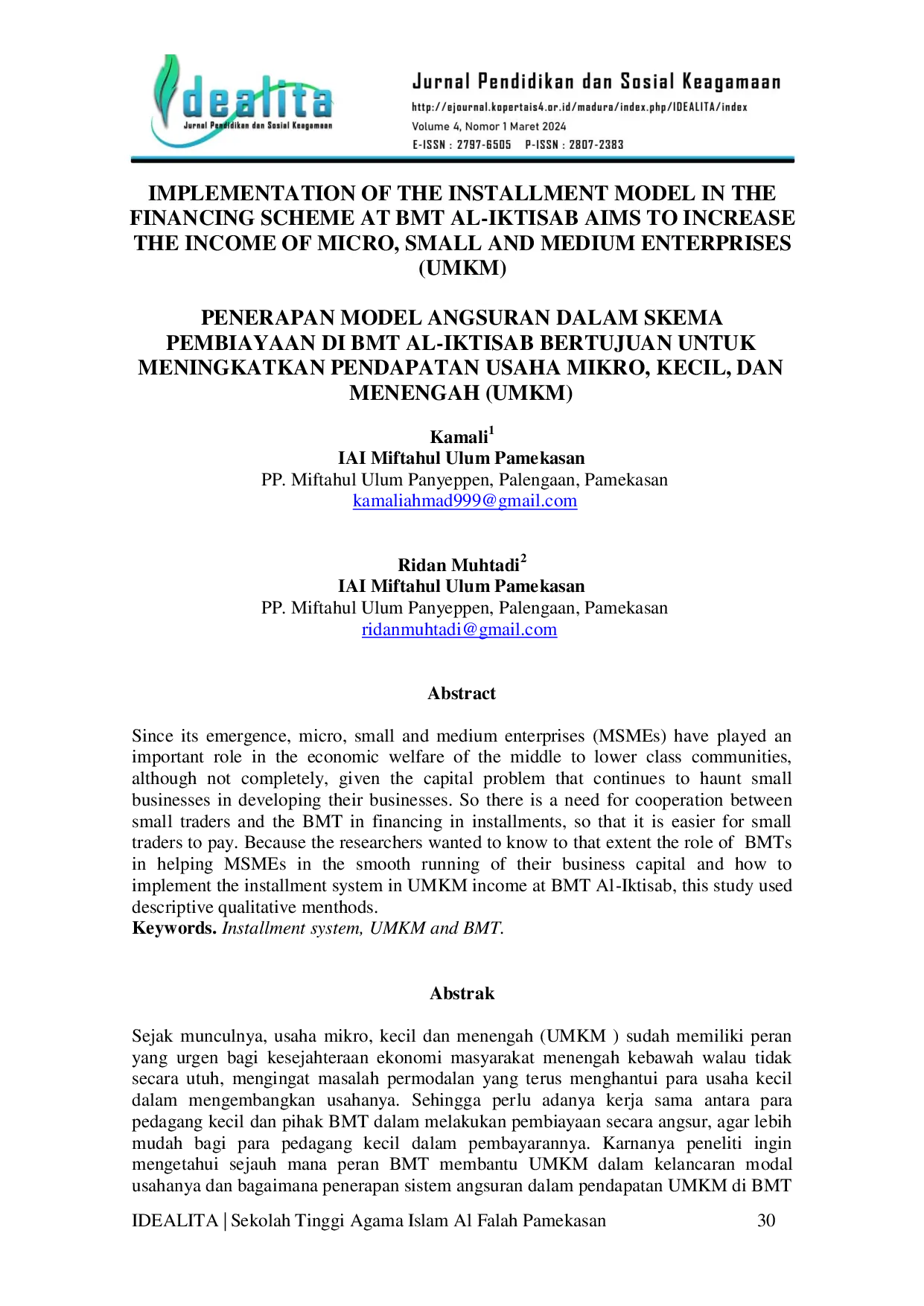 IDEALITA: Jurnal Pendidikan dan Sosial KeagamaanIDEALITA: Jurnal Pendidikan dan Sosial KeagamaanSejak munculnya, usaha mikro, kecil dan menengah (UMKM) sudah memiliki peran yang urgen bagi kesejahteraan ekonomi masyarakat menengah kebawah walau tidak secara utuh, mengingat masalah permodalan yang terus menghantui para usaha kecil dalam mengembangkan usahanya. Sehingga perlu adanya kerja sama antara para pedagang kecil dan pihak BMT dalam melakukan pembiayaan secara angsur, agar lebih mudah bagi para pedagang kecil dalam pembayarannya. Karena peneliti ingin mengetahui sejauh mana peran BMT membantu UMKM dalam kelancaran modal usahanya dan bagaimana penerapan sistem angsuran dalam pendapatan UMKM di BMT Al-Iktisab, penelitian ini menggunakan metode kualitatif deskriptif.