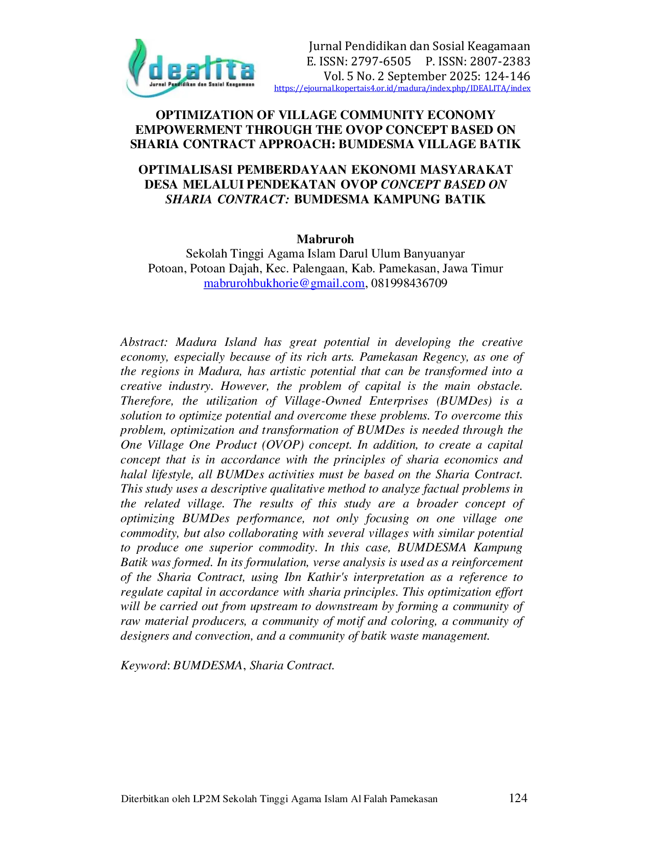 IDEALITA: Jurnal Pendidikan dan Sosial KeagamaanIDEALITA: Jurnal Pendidikan dan Sosial KeagamaanPulau Madura memiliki potensi besar dalam pengembangan ekonomi kreatif, terutama karena kekayaan keseniannya. Kabupaten Pamekasan, sebagai salah satu wilayah di Madura, memiliki potensi seni yang dapat diubah menjadi industri kreatif. Namun, masalah permodalan menjadi kendala utama. Oleh karena itu, pemanfaatan Badan Usaha Milik Desa (BUMDes) menjadi solusi untuk mengoptimalkan potensi dan mengatasi masalah tersebut. Untuk mengatasi masalah ini, diperlukan optimalisasi dan transformasi BUMDes melalui konsep One Village One Product (OVOP). Selain itu, untuk menciptakan konsep permodalan yang sesuai dengan prinsip-prinsip ekonomi syariah dan gaya hidup halal, semua aktivitas BUMDes harus didasarkan pada Sharia Contract. Penelitian ini menggunakan metode kualitatif deskriptif untuk menganalisis permasalahan faktual di desa terkait. Hasil penelitian ini adalah konsep optimalisasi kinerja BUMDes yang lebih luas, tidak hanya fokus pada satu desa satu komoditas, tetapi juga menggandeng beberapa desa dengan potensi serupa untuk memproduksi satu komoditas unggulan. Dalam hal ini, dibentuk BUMDESMA Kampung Batik. Dalam perumusannya, digunakan analisis ayat dan sebagai penguat Sharia Contract, dengan menggunakan tafsir Ibnu Katsir sebagai acuan untuk mengatur permodalan yang sesuai dengan prinsip syariah. Upaya optimalisasi ini akan dilakukan dari hulu hingga hilir dengan membentuk komunitas produsen bahan baku, komunitas pemotif dan pewarnaan, komunitas desainer dan konveksi, dan komunitas penanganan limbah batik.
