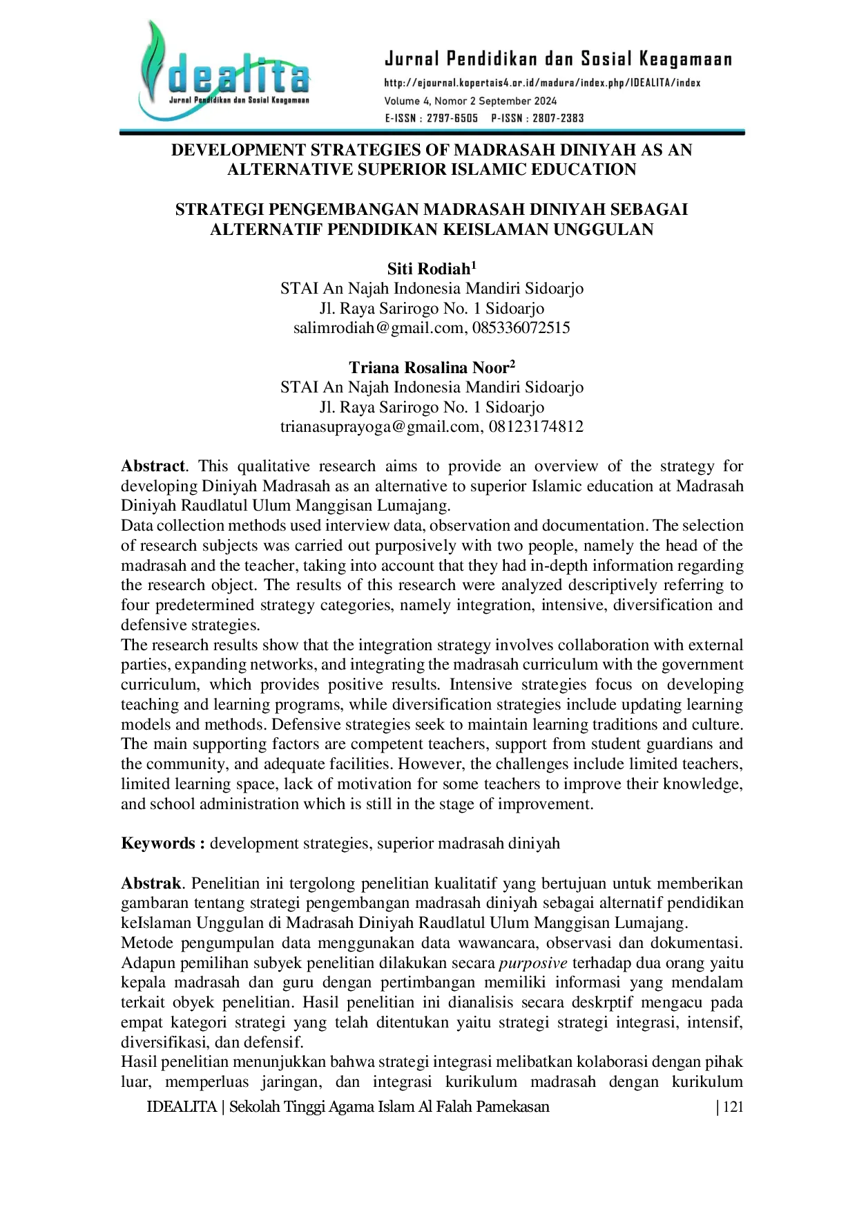 IDEALITA: Jurnal Pendidikan dan Sosial KeagamaanIDEALITA: Jurnal Pendidikan dan Sosial KeagamaanPenelitian ini tergolong penelitian kualitatif yang bertujuan untuk memberikan gambaran tentang di Madrasah Diniyah Raudlatul Ulum Manggisan Lumajang. Metode pengumpulan data menggunakan data wawancara, observasi dan dokumentasi. Adapun pemilihan subyek penelitian dilakukan secara purposive terhadap dua orang yaitu kepala madrasah dan guru dengan pertimbangan memiliki informasi yang mendalam terkait obyek penelitian. Hasil penelitian ini dianalisis secara deskriptif mengacu pada empat kategori strategi yang telah ditentukan yaitu strategi integrasi, intensif, diversifikasi, dan defensif. Hasil penelitian menunjukkan bahwa strategi integrasi melibatkan kolaborasi dengan pihak luar, memperluas jaringan, dan integrasi kurikulum madrasah dengan kurikulum pemerintah, yang memberikan hasil positif. Strategi intensif fokus pada pengembangan program belajar mengajar, sementara strategi diversifikasi mencakup pembaruan model dan metode pembelajaran. Strategi defensif berupaya mempertahankan tradisi dan budaya pembelajaran. Faktor pendukung utama adalah guru yang kompeten, dukungan dari wali santri dan masyarakat, serta fasilitas yang memadai. Namun, tantangannya meliputi keterbatasan guru, ruang belajar yang terbatas, kurangnya motivasi beberapa guru untuk meningkatkan keilmuan, dan administrasi sekolah yang masih dalam tahap pembenahan.