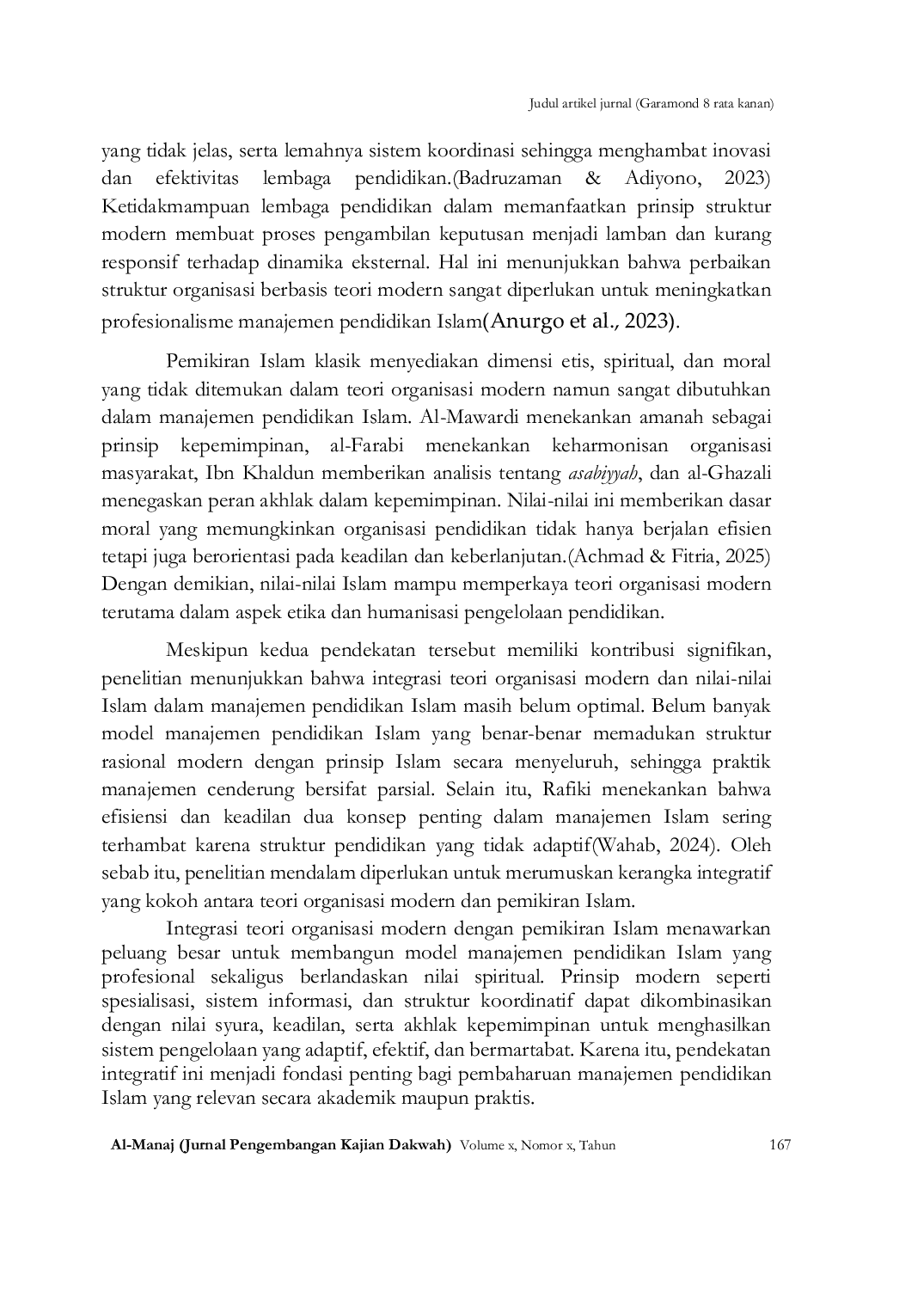 Al-Manaj : Jurnal Program Studi Manajemen DakwahAl-Manaj : Jurnal Program Studi Manajemen DakwahArtikel ini menganalisis integrasi antara teori organisasi struktur modern dan pemikiran Islam klasik dalam rangka membangun model manajemen pendidikan Islam yang lebih efektif, adaptif, dan bernilai. Penelitian ini menggunakan metode kualitatif dengan studi literatur, yang meliputi analisis isi terhadap teori organisasi modern termasuk birokrasi Weber, manajemen administratif Fayol, scientific management Taylor, teori sistem, serta teori jaringan kemudian dikomparasikan dengan gagasan Al-Mawardi, Al-Farabi, Ibn Khaldun, dan Al-Ghazali. Hasil pembahasan menunjukkan bahwa teori organisasi modern memberikan fondasi teknis yang kuat melalui struktur hierarkis yang jelas, pembagian kerja rasional, koordinasi sistematis, mekanisme umpan balik, serta pola jaringan kolaboratif yang meningkatkan efisiensi dan efektivitas lembaga pendidikan. Namun, kerangka teknis tersebut belum cukup tanpa dimensi moral-spiritual. Pemikiran Islam klasik melengkapi struktur modern dengan nilai keadilan, amanah, syura, integritas pemimpin, solidaritas sosial (ashabiyyah), serta orientasi kemaslahatan yang memperkuat legitimasi, etika, dan keseimbangan sistem organisasi. Integrasi kedua pendekatan ini menghasilkan model manajemen pendidikan Islam yang holistik dan berkarakter, karena menggabungkan profesionalitas struktural dengan nilai-nilai etis dan spiritual. Dengan demikian, sintesis teori modern dan pemikiran Islam menjadi landasan strategis untuk mewujudkan tata kelola pendidikan Islam yang unggul, responsif, dan berkelanjutan.