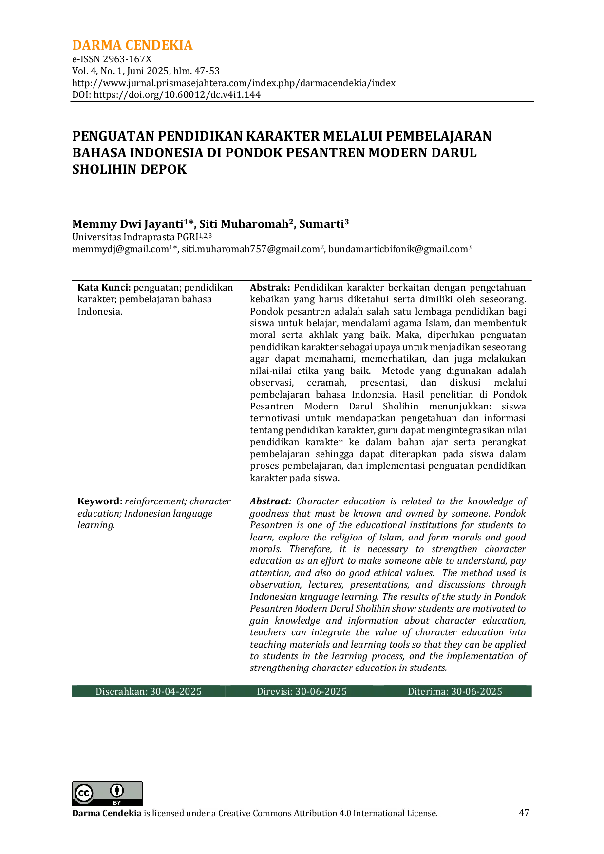 Darma CendekiaDarma CendekiaPendidikan karakter berkaitan dengan pengetahuan kebaikan yang harus diketahui serta dimiliki oleh seseorang. Pondok pesantren adalah salah satu lembaga pendidikan bagi siswa untuk belajar, mendalami agama Islam, dan membentuk moral serta akhlak yang baik. Maka, diperlukan penguatan pendidikan karakter sebagai upaya untuk menjadikan seseorang agar dapat memahami, memerhatikan, dan juga melakukan nilai-nilai etika yang baik. Metode yang digunakan adalah observasi, ceramah, presentasi, dan diskusi melalui pembelajaran bahasa Indonesia. Hasil penelitian di Pondok Pesantren Modern Darul Sholihin menunjukkan: siswa termotivasi untuk mendapatkan pengetahuan dan informasi tentang pendidikan karakter, guru dapat mengintegrasikan nilai pendidikan karakter ke dalam bahan ajar serta perangkat pembelajaran sehingga dapat diterapkan pada siswa dalam proses pembelajaran, dan implementasi penguatan pendidikan karakter pada siswa.