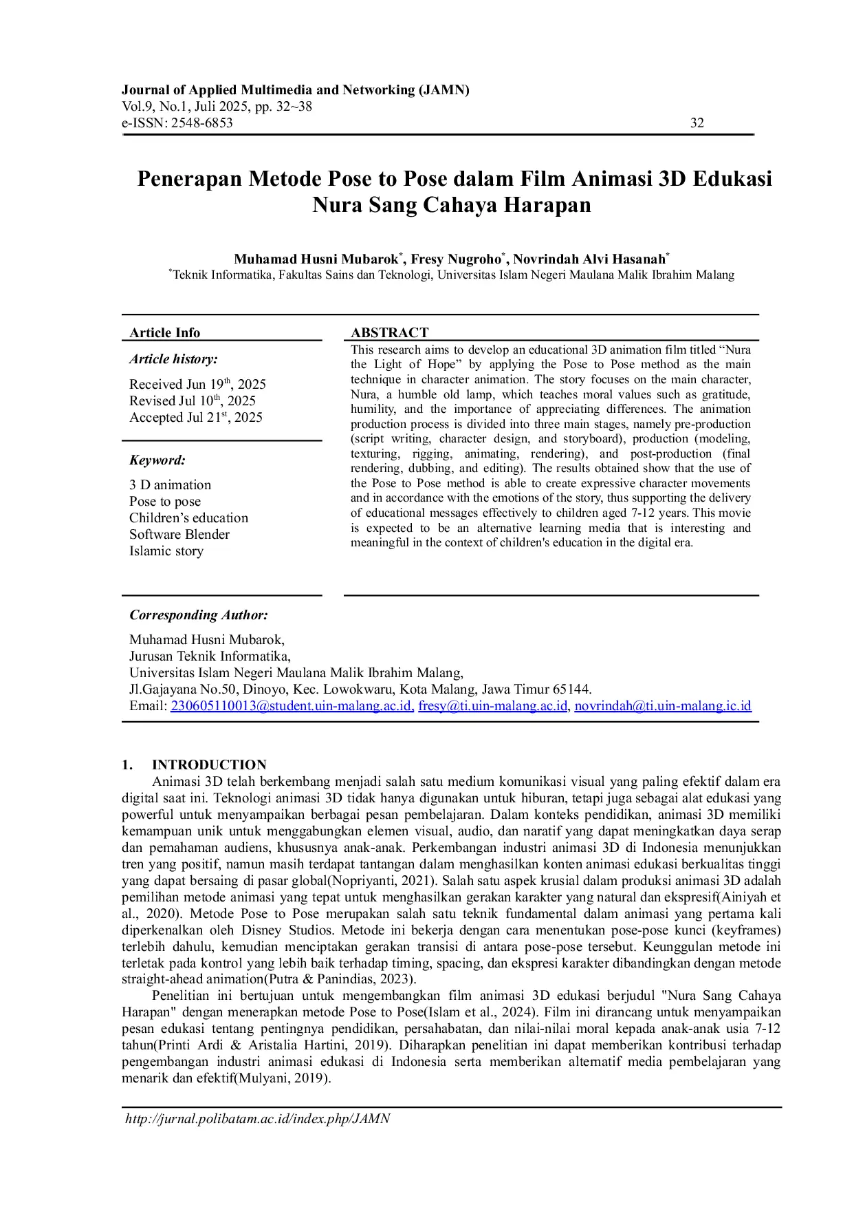 JOURNAL OF APPLIED MULTIMEDIA AND NETWORKINGJOURNAL OF APPLIED MULTIMEDIA AND NETWORKINGPenelitian ini bertujuan untuk mengembangkan film animasi 3D edukasi berjudul “Nura the Light of Hope dengan menerapkan metode Pose to Pose sebagai teknik utama dalam animasi karakter. Film ini berfokus pada karakter utama, Nura, sebuah lampu tua yang mengajarkan nilai-nilai moral seperti rasa syukur, kerendahan hati, dan pentingnya menghargai perbedaan. Proses produksi animasi dibagi menjadi tiga tahap utama, yaitu pra-produksi (penulisan skenario, desain karakter, dan storyboard), produksi (pemodelan, pewarnaan, rendering), dan pasca-produksi (rendering akhir, pengisi suara, dan penyuntingan). Hasil penelitian menunjukkan bahwa penggunaan metode Pose to Pose mampu menciptakan gerakan karakter yang ekspresif dan sesuai dengan emosi cerita, sehingga mendukung penyampaian pesan edukasi secara efektif kepada anak-anak usia 7-12 tahun. Film ini diharapkan menjadi media pembelajaran alternatif yang menarik dan bermakna dalam konteks pendidikan anak di era digital.