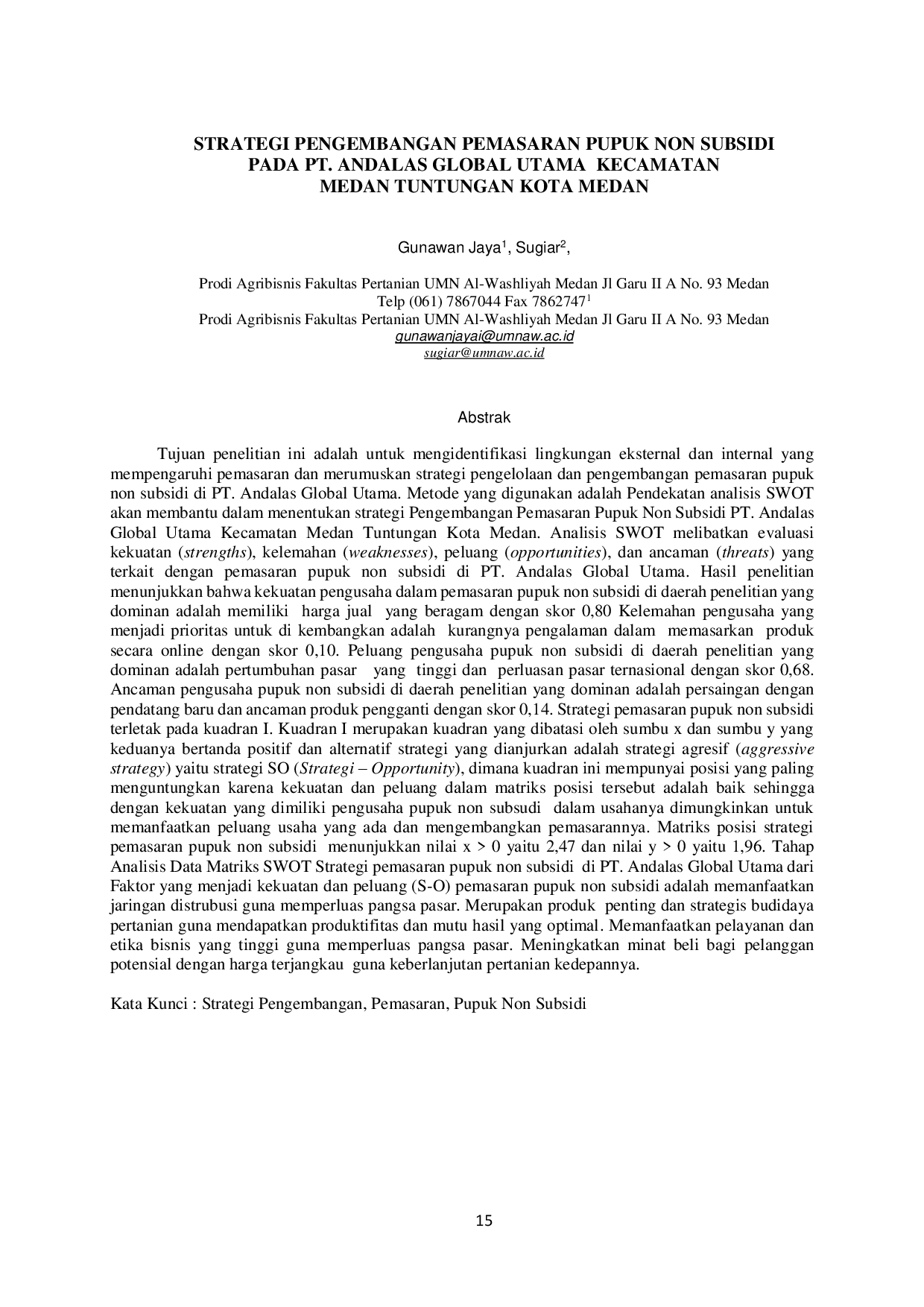 Kesimpulan dari penelitian ini adalah bahwa kekuatan pengusaha dalam pemasaran pupuk non subsidi di daerah penelitian yang dominan adalah memiliki harga jual yang beragam dengan skor 0,80.Kelemahan pengusaha yang menjadi prioritas untuk dikembangkan adalah kurangnya pengalaman dalam memasarkan produk secara online dengan skor 0,10.Peluang pengusaha pupuk non subsidi di daerah penelitian yang dominan adalah pertumbuhan pasar yang tinggi dan perluasan pasar ternasional dengan skor 0,68.Ancaman pengusaha pupuk non subsidi di daerah penelitian yang dominan adalah persaingan dengan pendatang baru dan ancaman produk pengganti dengan skor 0,14.Strategi pemasaran pupuk non subsidi terletak pada kuadran I.Kuadran I merupakan kuadran yang dibatasi oleh sumbu x dan sumbu y yang keduanya bertanda positif dan alternatif strategi yang dianjurkan adalah strategi agresif (aggressive strategy) yaitu strategi SO (Strategi – Opportunity), dimana kuadran ini mempunyai posisi yang paling menguntungkan karena kekuatan dan peluang dalam matriks posisi tersebut adalah baik sehingga dengan kekuatan yang dimiliki pengusaha pupuk non subsudi dalam usahanya dimungkinkan untuk memanfaatkan peluang usaha yang ada dan mengembangkan pemasarannya.Matriks posisi strategi pemasaran pupuk non subsidi menunjukkan nilai x > 0 yaitu 2,47 dan nilai y > 0 yaitu 1,96.Tahap Analisis Data Matriks SWOT Strategi pemasaran pupuk non subsidi di PT.Andalas Global Utama dari Faktor yang menjadi kekuatan dan peluang (S-O) pemasaran pupuk non subsidi adalah memanfaatkan jaringan distrubusi guna memperluas pangsa pasar.Merupakan produk penting dan strategis budidaya pertanian guna mendapatkan produktifitas dan mutu hasil yang optimal.Memanfaatkan pelayanan dan etika bisnis yang tinggi guna memperluas pangsa pasar.Meningkatkan minat beli bagi pelanggan potensial dengan harga terjangkau guna keberlanjutan pertanian kedepannya.