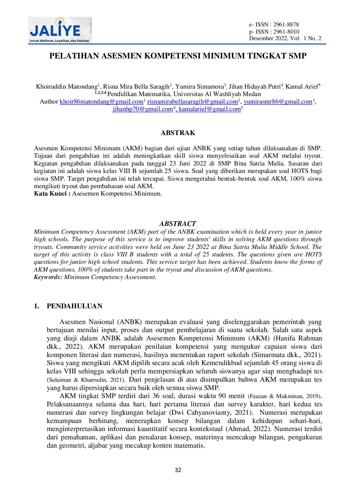 JALIYE: Jurnal Abdimas, Loyalitas, dan EdukasiJALIYE: Jurnal Abdimas, Loyalitas, dan EdukasiAsesmen Kompetensi Minimum (AKM) merupakan bagian dari ujian ANBK yang dilaksanakan setiap tahun di SMP. Tujuan pengabdian ini adalah meningkatkan keterampilan siswa dalam menyelesaikan soal AKM melalui kegiatan tryout. Kegiatan dilaksanakan pada tanggal 23 Juni 2022 di SMP Bina Satria Mulia dengan sasaran 25 siswa kelas VIII B. Soal yang diberikan merupakan soal HOTS untuk siswa SMP. Target pengabdian telah tercapai dengan siswa memahami bentuk-bentuk soal AKM, serta 100% peserta mengikuti tryout dan pembahasan soal AKM.