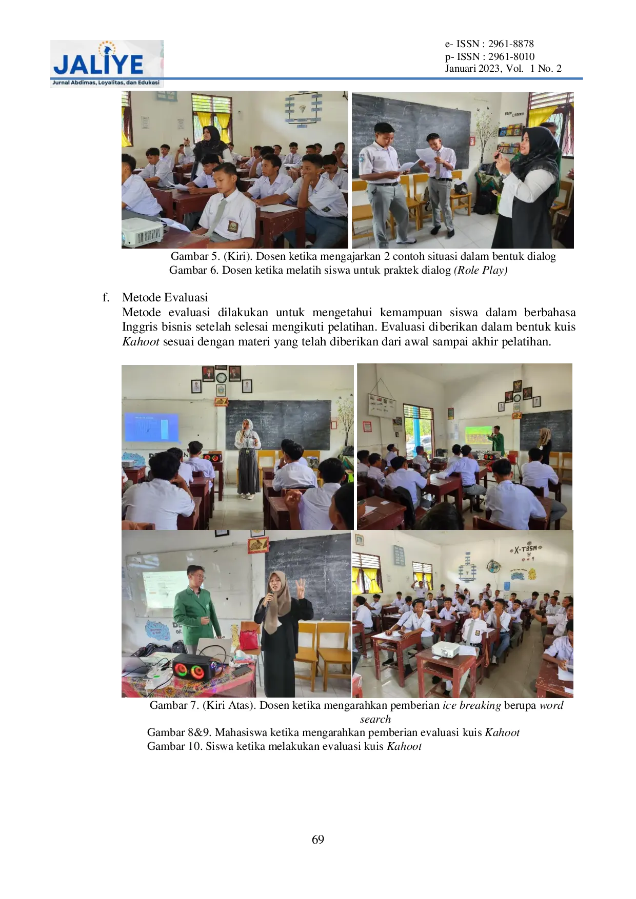 JALIYE: Jurnal Abdimas, Loyalitas, dan EdukasiJALIYE: Jurnal Abdimas, Loyalitas, dan EdukasiKegiatan pengabdian kepada masyarakat ini dilaksanakan dengan tujuan meningkatkan kemampuan berkomunikasi siswa SMK Gelora Pancasila dalam istilah-istilah bahasa Inggris bisnis (English for Business) khususnya pada materi telepon bisnis (business telephoning) sesuai dengan jurusan siswa yaitu Teknik Bisnis Sepeda Motor. Siswa-siswa SMK Gelora Pancasila selama ini masih mengenal istilah-istilah bahasa Inggris umum saja, untuk itu pelatihan ini diadakan agar siswa memiliki pengetahuan bahasa Inggris khusus yang berkaitan dengan bisnis agar dapat digunakan pada saat siswa berkarir nantinya. Metode yang digunakan dalam kegiatan ini adalah pelatihan bahasa Inggris berupa latihan pengucapan (pronunciation), dilanjutkan dengan mencari istilah tersebut dalam bentuk word search, kemudian pelatih memberikan contoh dialog dalam bentuk situasi ketika sedang melakukan transaksi jual beli sepeda motor, seperti cara menelepon dan menerima telepon dari pembeli, pembeli menanyakan informasi seputar sepeda motor yang akan dibeli, serta menerima keluhan dari pembeli, lalu siswa diajak untuk membuat dialognya sendiri dan mempraktikkannya langsung dengan temannya atau role play, dan di akhir pelatihan, siswa diberikan evaluasi dalam bentuk kuis Kahoot. Hasil dari kegiatan ini adalah peningkatan kemampuan berkomunikasi siswa dalam English for Business khususnya mengenai dalam business telephoning pada bisnis sepeda motor. Sehingga dapat disimpulkan kegiatan ini memberikan manfaat yang signifikan bagi siswa.