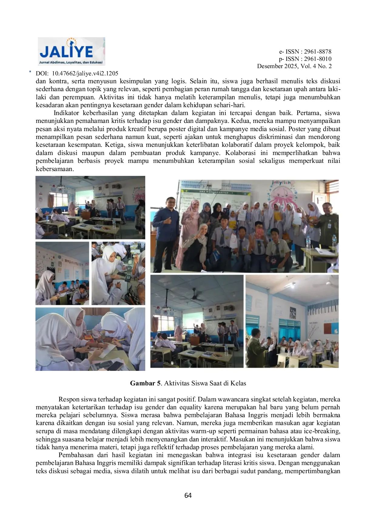 JALIYE: Jurnal Abdimas, Loyalitas, dan EdukasiJALIYE: Jurnal Abdimas, Loyalitas, dan EdukasiKegiatan pengabdian kepada masyarakat ini dilaksanakan di SMA Swasta Muhammadiyah 1 Medan pada tanggal 16 September 2025 dengan tujuan memperkuat literasi kritis dan kesadaran gender siswa melalui unit pembelajaran Voice and Visibility. Unit ini dirancang sebagai respon atas minimnya integrasi isu kesetaraan gender (SDG 5) dalam buku ajar Bahasa Inggris Kurikulum Merdeka. Metode pelaksanaan menggunakan pendekatan berbasis genre (GBA), problem-based learning (PBL), dan project-based learning (PjBL) dengan durasi 90 menit, melibatkan 30 siswa kelas XII. Aktivitas meliputi analisis teks diskusi, penulisan teks argumentatif, serta proyek kreatif berupa kampanye digital tentang kesetaraan gender. Hasil kegiatan menunjukkan bahwa siswa mampu memahami isu gender secara kritis, menyampaikan pesan aksi nyata melalui poster dan kampanye digital, serta menunjukkan keterlibatan kolaboratif dalam proyek. Respon siswa positif, dengan ketertarikan pada isu gender sebagai hal baru yang belum pernah mereka pelajari sebelumnya, meskipun mereka menyarankan adanya aktivitas warm-up untuk meningkatkan suasana belajar. Kegiatan ini menegaskan pentingnya integrasi nilai keberlanjutan dan kesetaraan gender dalam pembelajaran Bahasa Inggris sebagai dukungan terhadap pencapaian SDG 5.