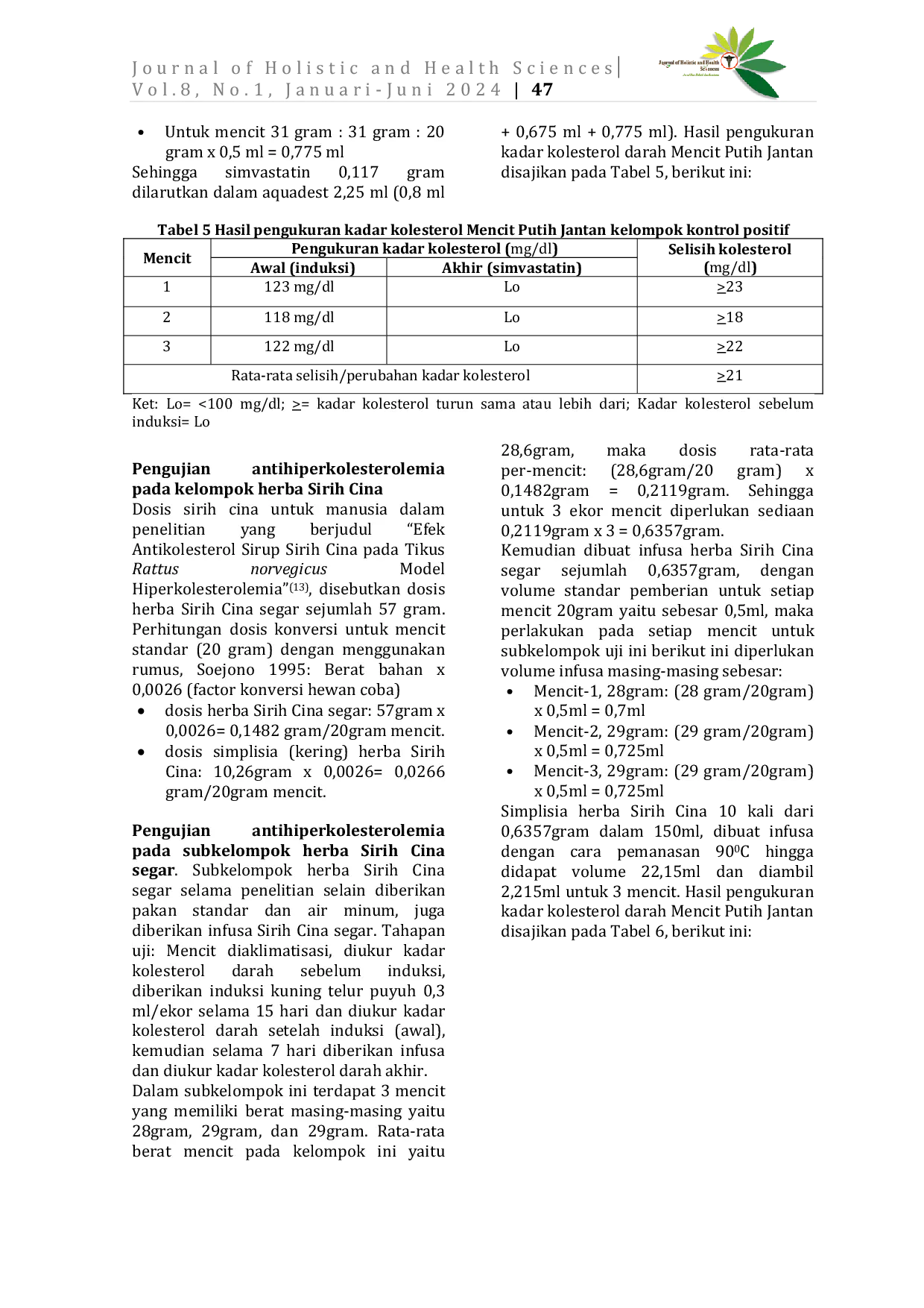 Journal of Holistic and Health Sciences (Jurnal Ilmu Holistik dan Kesehatan)Journal of Holistic and Health Sciences (Jurnal Ilmu Holistik dan Kesehatan)Banyak tumbuhan liar berkhasiat obat yang dikonsumsi oleh masyarakat pedesaan. Salah satunya adalah Sirih Cina (Peperomia pellucida L. Kunth) yang menunjukkan aktivitas analgesik, antipiretik, anti-inflamasi, hipoglikemik, antifungal, antimicrobial, anticancer, antioxidant, antidiabetic, dan antibacterial. Tumbuhan Sirih Cina mengandung alkaloids, flavonoids, dan tannins. Aktivitas antioksidan Sirih Cina menurunkan kadar kolesterol darah dengan mencegah oksidasi LDL yang menumpuk di dinding arteri dan serabut otot jantung, yang berasal dari senyawa flavonoid. Penelitian ini bertujuan untuk mengetahui perbandingan aktivitas penurunan kadar kolesterol darah oleh infusa herba Sirih Cina segar dan simplisianya.