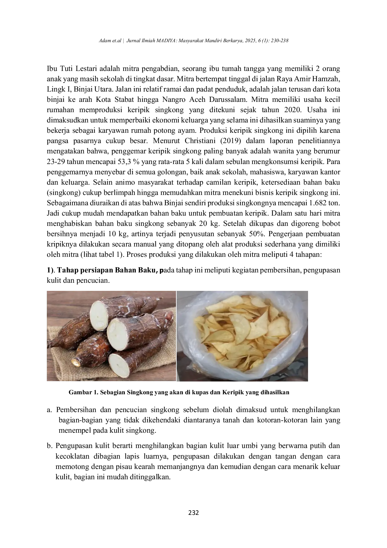 Jurnal Ilmiah Madiya (Masyarakat Mandiri Berkarya)Jurnal Ilmiah Madiya (Masyarakat Mandiri Berkarya)Mitra pengabdian Ibu Tuti Lestari adalah pelaku Usaha Mikro Kecil Menengah (UMKM) yang memproduksi keripik singkong. Omset hariannya sangat kecil, hanya 20 kg singkong atau 10 kg keripik, dipasarkan di warung-warung kecil dan kantin sekolah. Permintaan selalu lebih tinggi dari kemampuan produksi mitra, diperkirakan lebih dari 60% tambahan yang tidak dapat dipenuhi. Ketidakmampuan ini disebabkan oleh kekurangan tenaga kerja, penurunan mutu keripik akibat pengirisan manual yang tidak seragam, dan tidak adanya alat pengiris singkong yang cepat. Untuk mengatasi masalah ini, tim pengabdian Politeknik Negeri Medan bekerja sama dengan mitra. Metode yang digunakan meliputi survei lokasi, review desain mesin, pembuatan dan perakitan mesin, uji kinerja, hibah dan pelatihan, publikasi kegiatan, dan pelaporan. Luaran yang diharapkan adalah 1 unit mesin pengiris ubi kapasitas 60 kg/jam, publikasi ilmiah, dan publikasi di media massa dan YouTube.