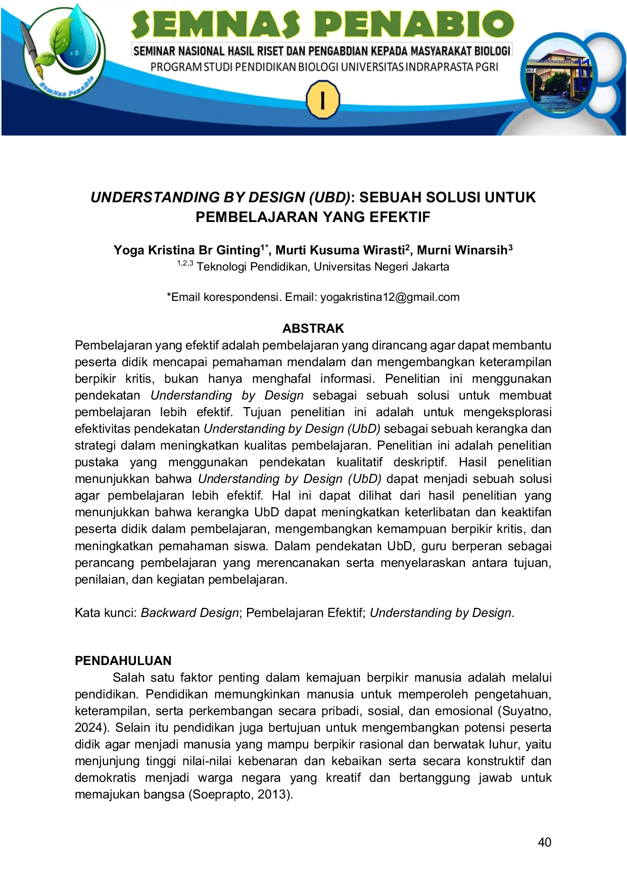 Prosiding Semnas PenaBioProsiding Semnas PenaBioPembelajaran yang efektif adalah pembelajaran yang dirancang agar dapat membantu peserta didik mencapai pemahaman mendalam dan mengembangkan keterampilan berpikir kritis, bukan hanya menghafal informasi. Penelitian ini menggunakan pendekatan Understanding by Design sebagai sebuah solusi untuk membuat pembelajaran lebih efektif. Tujuan penelitian ini adalah untuk mengeksplorasi efektivitas pendekatan Understanding by Design (UbD) sebagai sebuah kerangka dan strategi dalam meningkatkan kualitas pembelajaran. Penelitian ini adalah penelitian pustaka yang menggunakan pendekatan kualitatif deskriptif. Hasil penelitian menunjukkan bahwa Understanding by Design (UbD) dapat menjadi sebuah solusi agar pembelajaran lebih efektif. Hal ini dapat dilihat dari hasil penelitian yang menunjukkan bahwa kerangka UbD dapat meningkatkan keterlibatan dan keaktifan peserta didik dalam pembelajaran, mengembangkan kemampuan berpikir kritis, dan meningkatkan pemahaman siswa. Dalam pendekatan UbD, guru berperan sebagai perancang pembelajaran yang merencanakan serta menyelaraskan antara tujuan, penilaian, dan kegiatan pembelajaran.