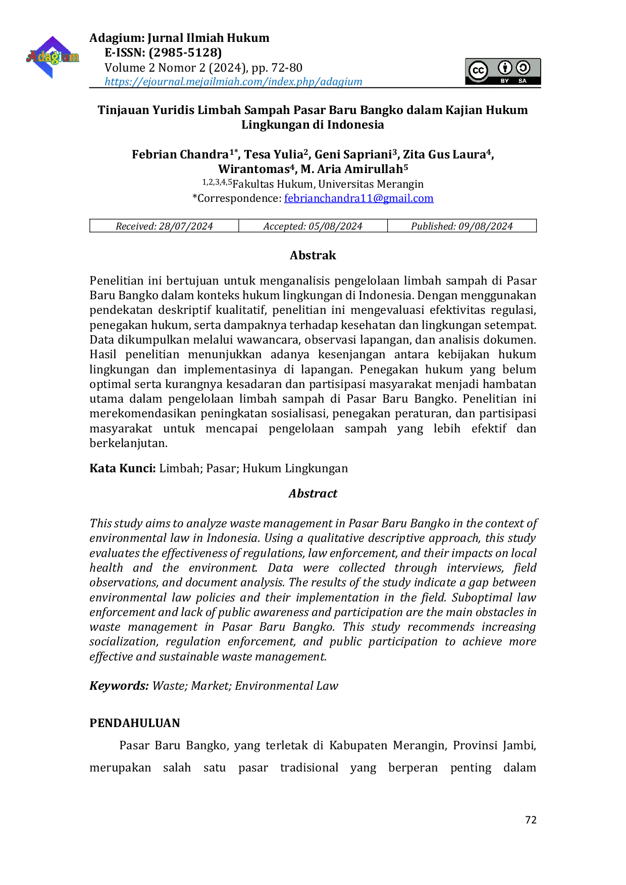 Adagium: Jurnal Ilmiah HukumAdagium: Jurnal Ilmiah HukumPenelitian ini bertujuan untuk menganalisis pengelolaan limbah sampah di Pasar Baru Bangko dalam konteks hukum lingkungan di Indonesia. Dengan menggunakan pendekatan deskriptif kualitatif, penelitian ini mengevaluasi efektivitas regulasi, penegakan hukum, serta dampaknya terhadap kesehatan dan lingkungan setempat. Data dikumpulkan melalui wawancara, observasi lapangan, dan analisis dokumen. Hasil penelitian menunjukkan adanya kesenjangan antara kebijakan hukum lingkungan dan implementasinya di lapangan. Penegakan hukum yang belum optimal serta kurangnya kesadaran dan partisipasi masyarakat menjadi hambatan utama dalam pengelolaan limbah sampah di Pasar Baru Bangko. Penelitian ini merekomendasikan peningkatan sosialisasi, penegakan peraturan, dan partisipasi masyarakat untuk mencapai pengelolaan sampah yang lebih efektif dan berkelanjutan.