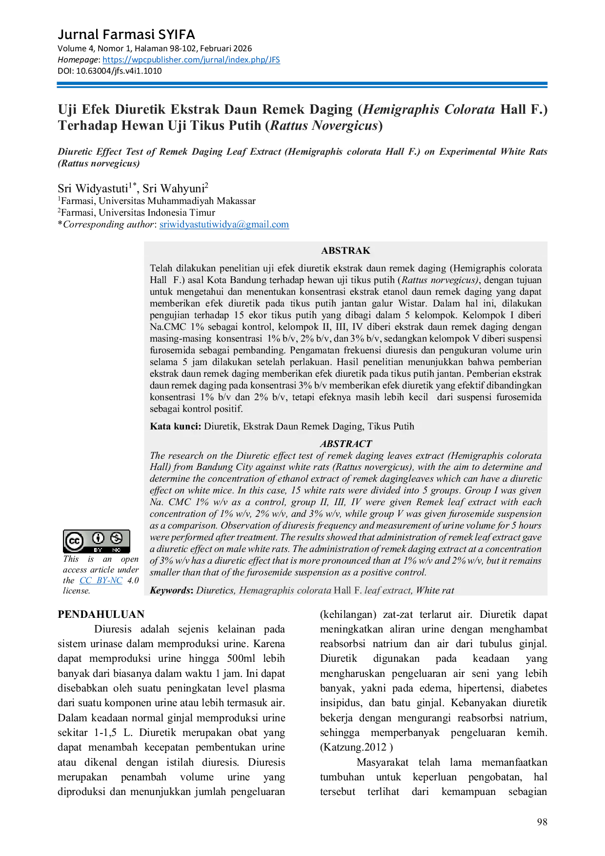 - Uji Efek Diuretik Ekstrak Daun Remek Daging (Hemigraphis Colorata Hall F.) Terhadap Hewan Uji Tikus Putih... wpcpublisher.com/jurnal/index.php/JFS/article/view/1010Uji Efek Diuretik Ekstrak Daun Remek Daging Hemigraphis Colorata Hall F Terhadap Hewan Uji Tikus Putih wpcpublisher jurnal index php JFS article view 1010