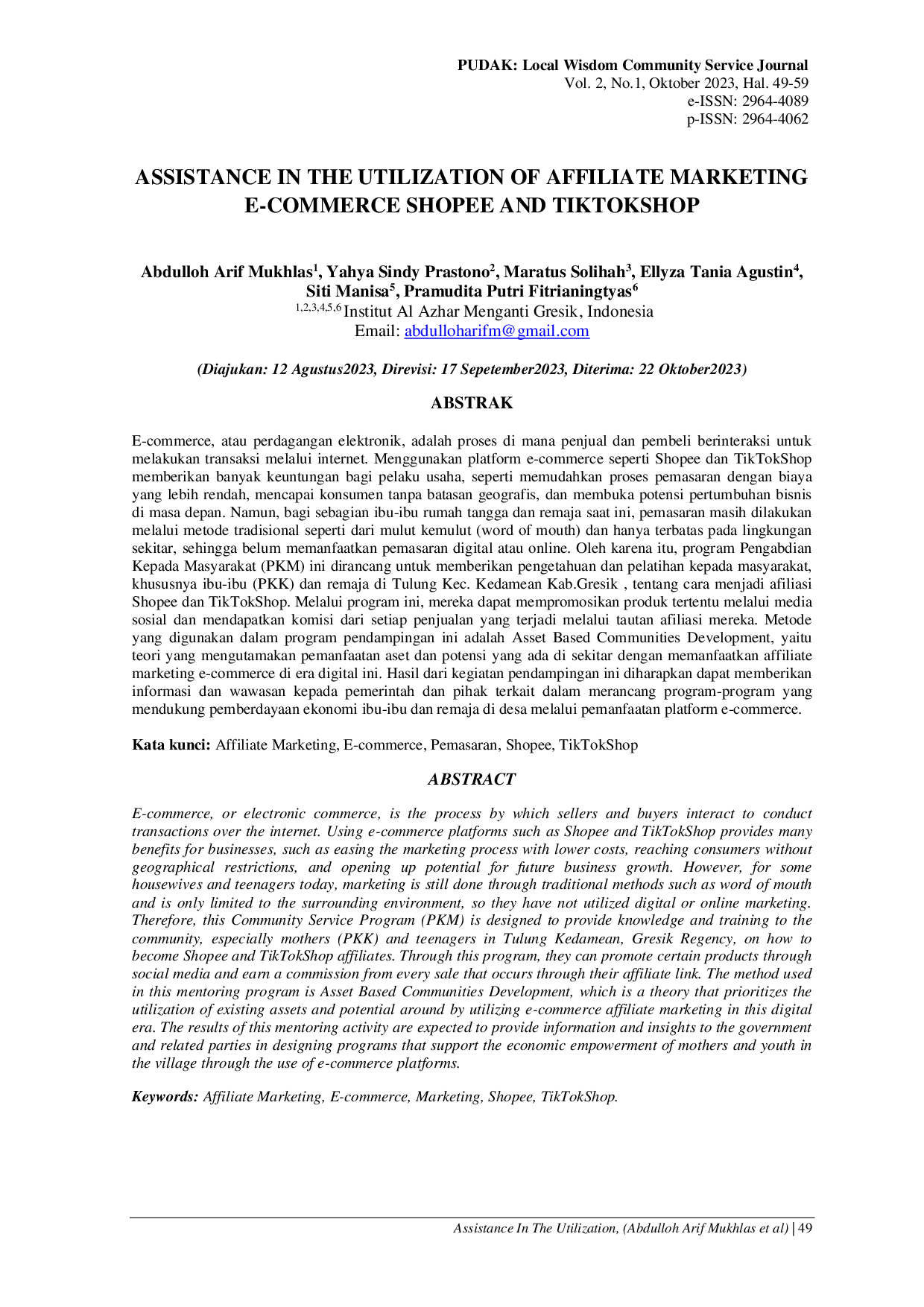 PUDAK: Local Wisdom Community JournalPUDAK: Local Wisdom Community JournalE-commerce, atau perdagangan elektronik, adalah proses di mana penjual dan pembeli berinteraksi untuk melakukan transaksi melalui internet. Menggunakan platform e-commerce seperti Shopee dan TikTokShop memberikan banyak keuntungan bagi pelaku usaha, seperti memudahkan proses pemasaran dengan biaya yang lebih rendah, mencapai konsumen tanpa batasan geografis, dan membuka potensi pertumbuhan bisnis di masa depan. Namun, bagi sebagian ibu-ibu rumah tangga dan remaja saat ini, pemasaran masih dilakukan melalui metode tradisional seperti dari mulut ke mulut (word of mouth) dan hanya terbatas pada lingkungan sekitar, sehingga belum memanfaatkan pemasaran digital atau online. Oleh karena itu, program Pengabdian Kepada Masyarakat (PKM) ini dirancang untuk memberikan pengetahuan dan pelatihan kepada masyarakat, khususnya ibu-ibu (PKK) dan remaja di Tulung Kec. Kedamean Kab. Gresik, tentang cara menjadi afiliasi Shopee dan TikTokShop. Melalui program ini, mereka dapat mempromosikan produk tertentu melalui media sosial dan mendapatkan komisi dari setiap penjualan yang terjadi melalui tautan afiliasi mereka. Metode yang digunakan dalam program pendampingan ini adalah Asset Based Communities Development, yaitu teori yang mengutamakan pemanfaatan aset dan potensi yang ada di sekitar dengan memanfaatkan affiliate marketing e-commerce di era digital ini. Hasil dari kegiatan pendampingan ini diharapkan dapat memberikan informasi dan wawasan kepada pemerintah dan pihak terkait dalam merancang program-program yang mendukung pemberdayaan ekonomi ibu-ibu dan remaja di desa melalui pemanfaatan platform e-commerce.