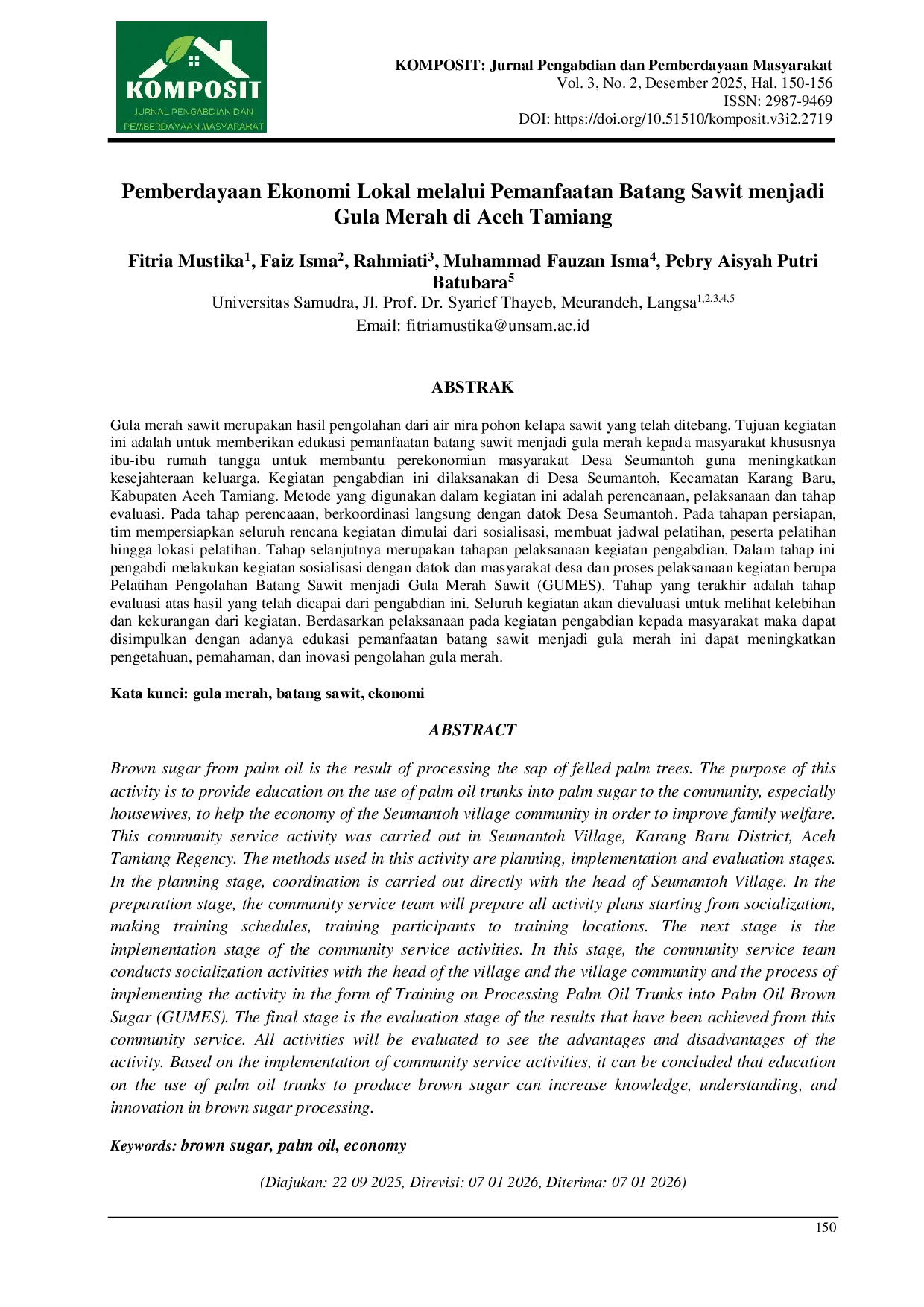 Jurnal Pengabdian dan Pemberdayaan MasyarakatJurnal Pengabdian dan Pemberdayaan MasyarakatGula merah sawit merupakan hasil pengolahan dari air nira pohon kelapa sawit yang telah ditebang. Tujuan dari kegiatan ini adalah untuk memberikan edukasi mengenai pemanfaatan batang sawit menjadi gula merah kepada masyarakat, khususnya ibu rumah tangga, guna membantu perekonomian masyarakat Desa Seumantoh dan meningkatkan kesejahteraan keluarga. Kegiatan pengabdian ini dilaksanakan di Desa Seumantoh, Kecamatan Karang Baru, Kabupaten Aceh Tamiang. Metode yang digunakan meliputi perencanaan, pelaksanaan, dan evaluasi. Pada tahap perencanaan, koordinasi dilakukan langsung dengan datok Desa Seumantoh. Tahap persiapan melibatkan persiapan seluruh rencana kegiatan, mulai dari sosialisasi, penjadwalan pelatihan, hingga penentuan peserta dan lokasi pelatihan. Selanjutnya, tahap pelaksanaan kegiatan pengabdian dilakukan dengan sosialisasi kepada datok dan masyarakat desa, serta pelatihan pengolahan batang sawit menjadi gula merah sawit (GUMES). Tahap terakhir adalah evaluasi hasil pengabdian. Seluruh kegiatan dievaluasi untuk mengidentifikasi kelebihan dan kekurangan. Berdasarkan pelaksanaan kegiatan pengabdian, dapat disimpulkan bahwa edukasi pemanfaatan batang sawit menjadi gula merah dapat meningkatkan pengetahuan, pemahaman, dan inovasi dalam pengolahan gula merah.
