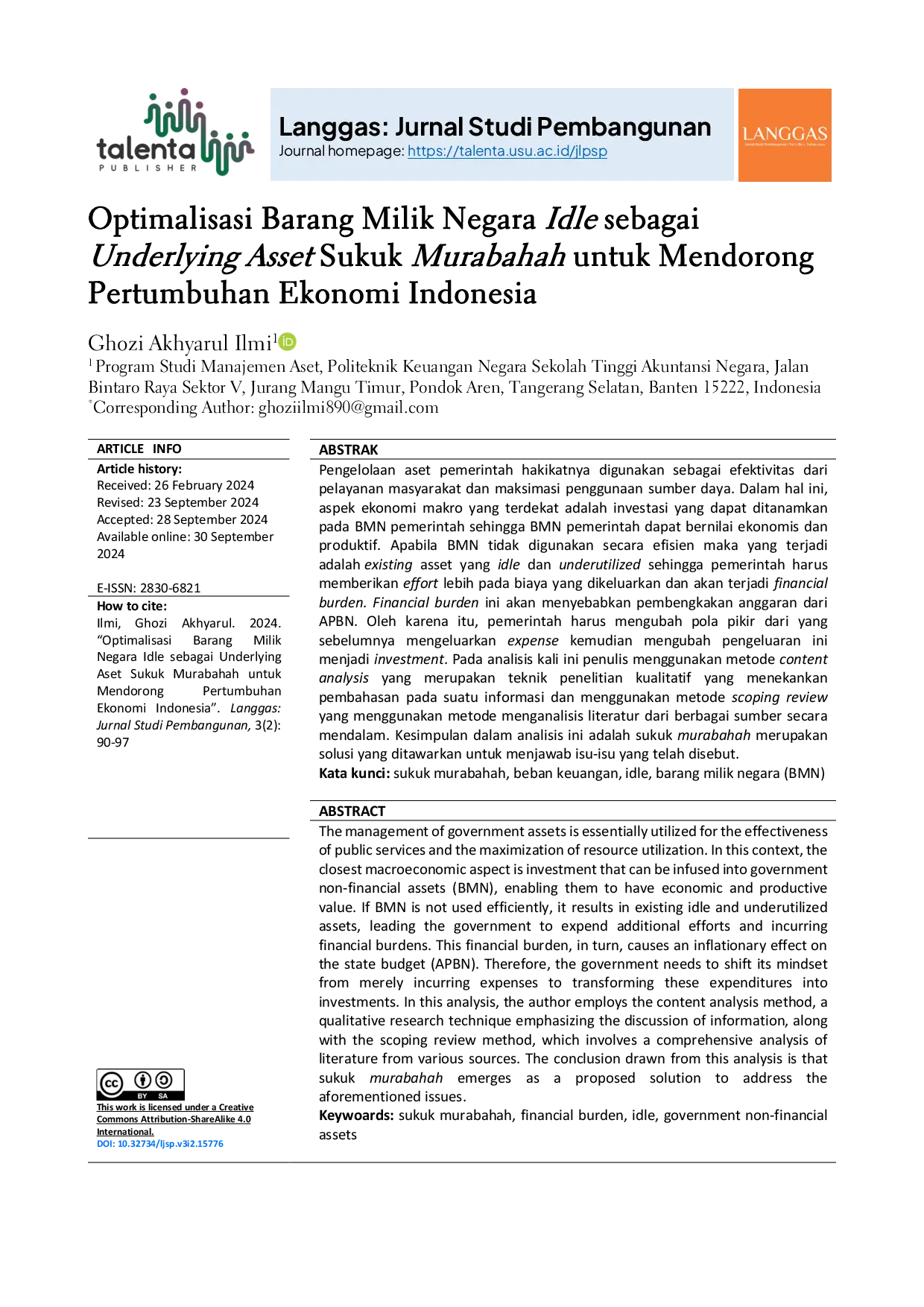 Langgas: Jurnal Studi PembangunanLanggas: Jurnal Studi PembangunanPengelolaan aset pemerintah bertujuan untuk efektivitas pelayanan masyarakat dan memaksimalkan sumber daya. Investasi pada aset pemerintah dapat meningkatkan nilai ekonomis dan produktivitas. BMN yang tidak efisien menyebabkan aset idle dan beban keuangan yang membengkakkan APBN. Oleh karena itu, pemerintah perlu mengubah pola pikir dari pengeluaran menjadi investasi. Analisis ini menggunakan metode content analysis dan scoping review untuk menyimpulkan bahwa sukuk murabahah merupakan solusi untuk mengatasi isu-isu tersebut.