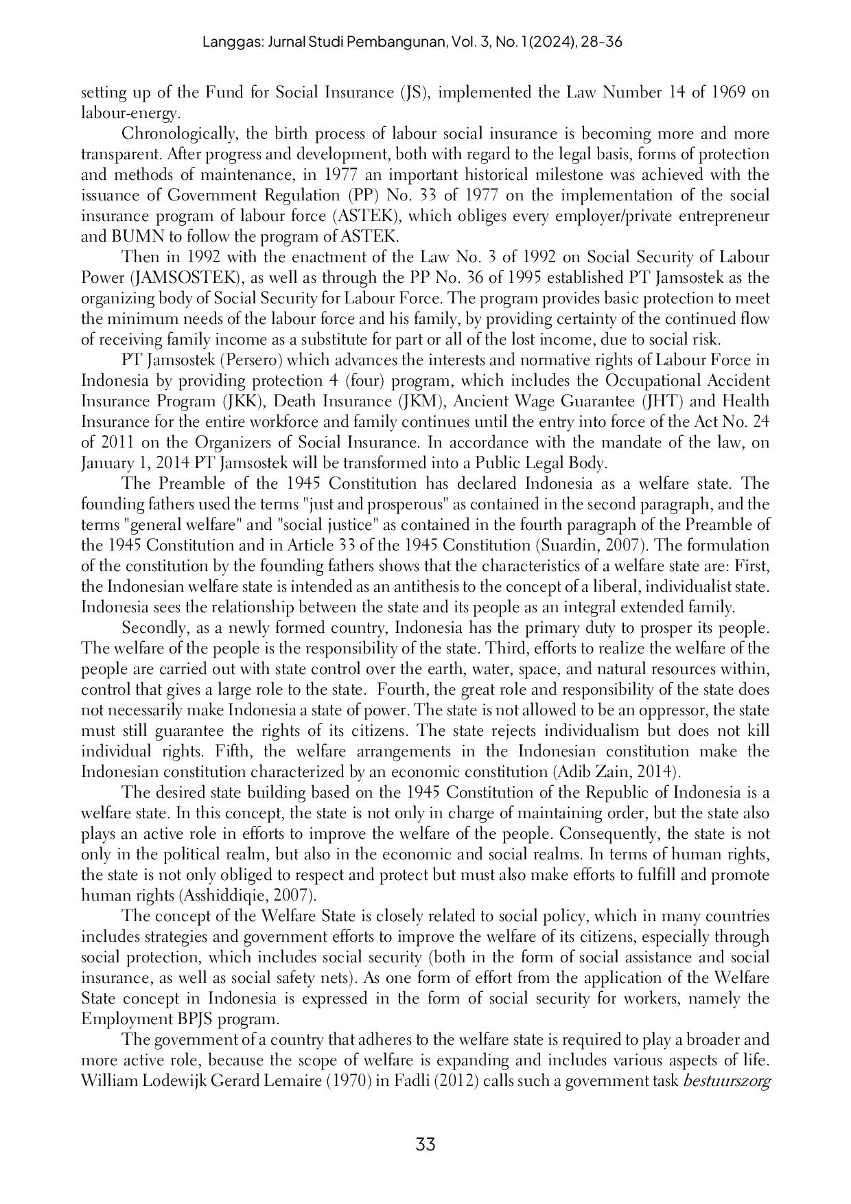 Langgas: Jurnal Studi PembangunanLanggas: Jurnal Studi PembangunanBadan Penyeleggara Jaminan Sosial (BPJS) Ketenagakerjaan sebagai asuransi perlindungan sosial seluruh pekerja di Indonesia memiliki lima produk utama. Setiap produk BPJS Ketenagakerjaan memiliki manfaat dan keuntungan bagi pesertanya. Tujuan dari penelitian ini peneliti ingin mengetahui dan menganalisis bagaimana Konsep Negara Kesejahteraan sejalan dengan BPJS Ketenagakerjaan di Indonesia, pertanyaan apakah pelaksanaannya sudah sesuai dengan prinsip perlindungan yang terdapat pada konsep Negara Kesejahteraan, meskipun Indonesia bukan penganut paham Negara Kesejahteraan. Metode Penelitian ini bersifat kualitatif yaitu dengan cara mendeskripsikan serta menganalisis data yang telah diperoleh melalui teknik pengumpulan data wawancara dan studi pustaka, selanjutnya dijabarkan dalam bentuk penjelasan secara detail dan sistematis. Hasil dari penelitian ini menunjukkan bahwa berdasarkan tipologi Negara Kesejahteraan yang di rumuskan oleh Titmus sesuai dengan fasilitasi manfaat yang diberikan oleh BPJS Ketenagakerjaan diwujudkaan dengan manfaat jaminan kematian, jaminan kecelakaan kerja dan jaminan hari tua yang memberikan manfaat perlindungan kepada pekerja ketika tidak bisa menjalankan pekerjaan saat sakit, memberikan santunan dan beasiswa kepada keluarga yang kehilangan sumber mata pencahariannya dan beberapa manfaat lainya.