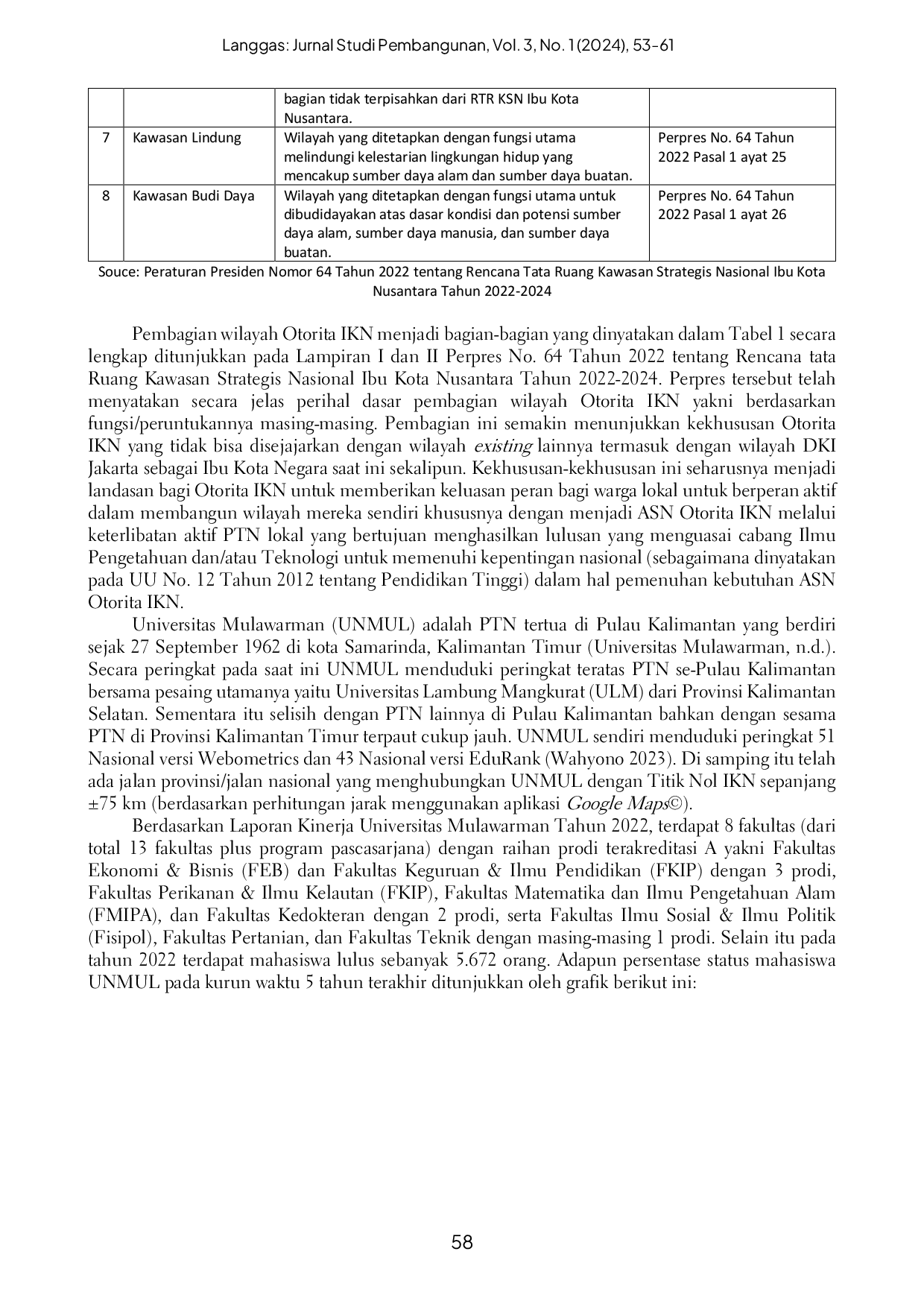 Secara keseluruhan penelitian ini menghasilkan beberapa temuan yaitu pertama adalah kekhususan IKN sebagai Otorita yang di satu sisi memiliki derajat setingkat kementerian sehingga dapat dianggap sebagai Lembaga Pemerintah Non Kementerian/LPNK namun di sisi lain memiliki (bagian) wilayah dalam Negara Kesatuan Republik Indonesia sebagaimana Pemerintahan Daerah.Kekhususan lainnya adalah pembagian wilayah dalam Otorita IKN tidak berdasarkan administrasi melainkan berdasarkan fungsi/peruntukannya.Temuan kedua adalah Universitas Mulawarman (UNMUL) sebagai PTN tertua sekaligus dengan peringkat teratas di Pulau Kalimantan yang telah memiliki program studi yang berkorelasi pada beberapa aspek yang menjadi kriteria pada proses rekrutmen ASN IKN.UNMUL telah menghasilkan lulusan yang secara kuantitatif mampu menyiapkan calon ASN untuk kebutuhan Otorita IKN.