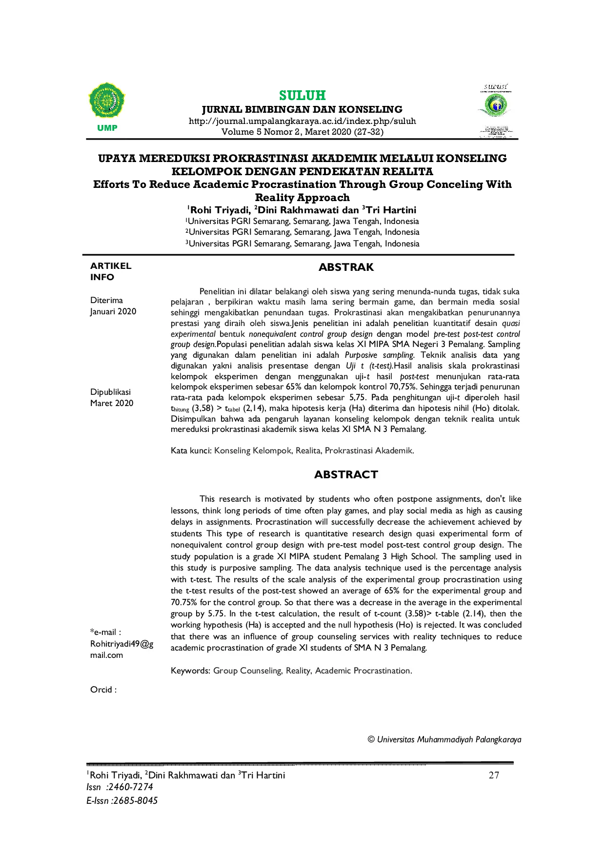 Suluh: Jurnal Bimbingan dan KonselingSuluh: Jurnal Bimbingan dan KonselingPenelitian ini dilatarbelakangi oleh siswa yang sering menunda-nunda tugas, tidak menyukai pelajaran, berpikir waktu masih lama, sering bermain game, dan bermain media sosial sehingga mengakibatkan penundaan tugas. Prokrastinasi akan mengakibatkan penurunan prestasi yang diraih oleh siswa. Jenis penelitian ini adalah penelitian kuantitatif dengan desain quasi experimental bentuk nonequivalent control group design dengan model pre-test post-test control group design. Populasi penelitian adalah siswa kelas XI MIPA SMA Negeri 3 Pemalang. Sampling yang digunakan dalam penelitian ini adalah purposive sampling. Teknik analisis data yang digunakan yakni analisis presentase dengan Uji t (t-test). Hasil analisis skala prokrastinasi kelompok eksperimen dengan menggunakan uji-t hasil post-test menunjukkan rata-rata kelompok eksperimen sebesar 65% dan kelompok kontrol 70,75%. Sehingga terjadi penurunan rata-rata pada kelompok eksperimen sebesar 5,75. Pada penghitungan uji-t diperoleh hasil thitung (3,58) > ttabel (2,14), maka hipotesis kerja (Ha) diterima dan hipotesis nihil (Ho) ditolak. Disimpulkan bahwa ada pengaruh layanan konseling kelompok dengan teknik realita untuk mereduksi prokrastinasi akademik siswa kelas XI SMA N 3 Pemalang.