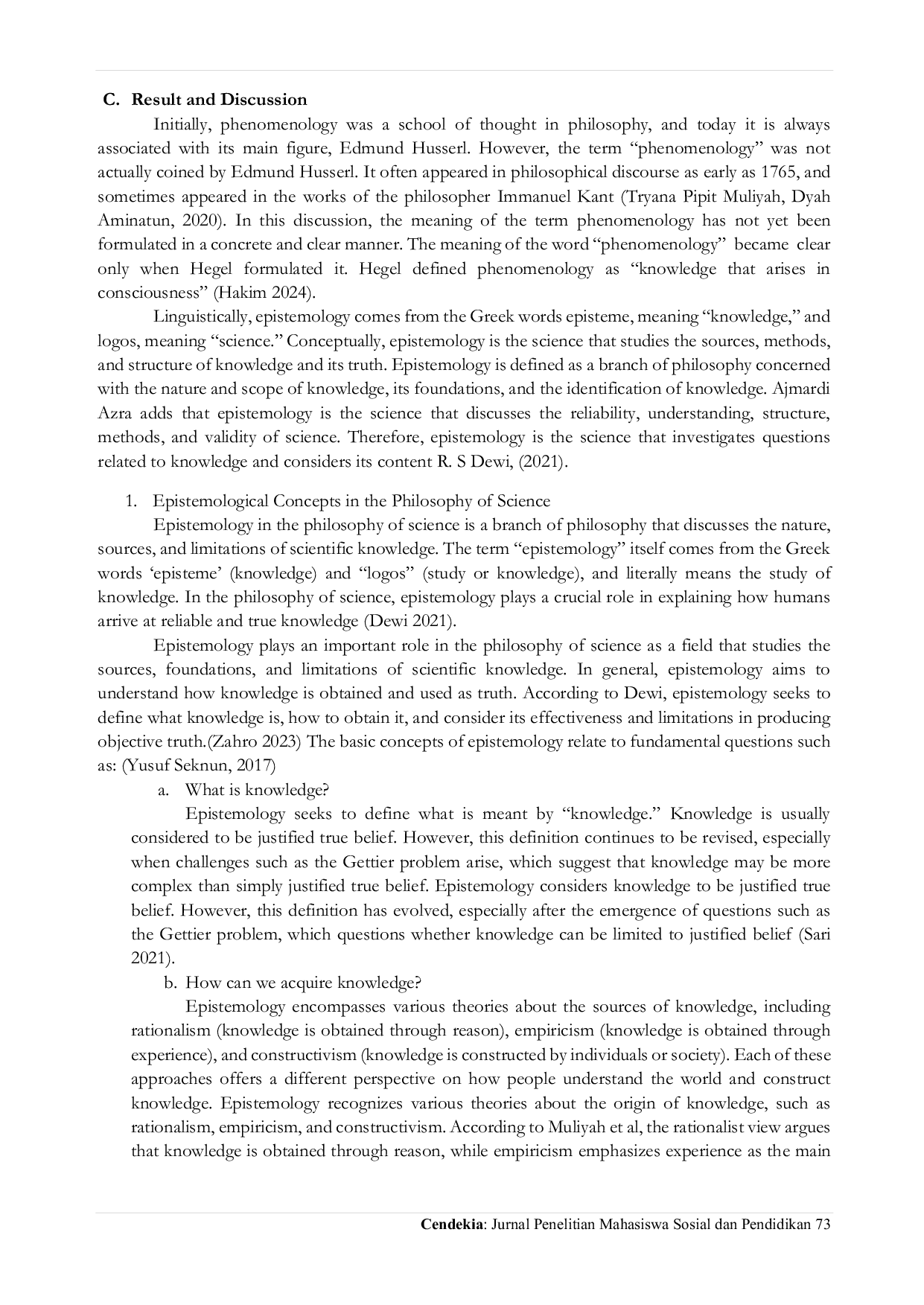 Cendekia: Jurnal Penelitian Mahasiswa Sosial dan PendidikanCendekia: Jurnal Penelitian Mahasiswa Sosial dan PendidikanKajian ini bertujuan untuk mengeksplorasi peran serta hubungan antara epistemologi dan fenomenologi dalam kerangka filsafat ilmu, khususnya dalam konteks pendidikan. Epistemologi sebagai cabang filsafat yang membahas hakikat, sumber, struktur, dan validitas pengetahuan, memberikan landasan teoritis dalam memahami proses berpikir ilmiah dan konstruksi pengetahuan. Sementara itu, fenomenologi menekankan pada pengalaman langsung dan kesadaran subyektif sebagai sarana memahami realitas, yang dalam praktik pendidikan sangat penting untuk memahami pengalaman belajar individu secara mendalam. Meskipun memiliki pendekatan yang berbeda—epistemologi bersifat analitik dan normatif, sedangkan fenomenologi bersifat deskriptif dan intuitif—keduanya saling melengkapi dalam memberikan perspektif yang utuh terhadap dinamika ilmu pengetahuan. Integrasi epistemologi dan fenomenologi dalam filsafat ilmu membuka ruang bagi pemahaman yang lebih holistik, di mana objektivitas pengetahuan ilmiah diperkuat oleh pemaknaan subyektif yang berasal dari pengalaman langsung manusia. Pendekatan ini memiliki relevansi yang tinggi dalam pendidikan kontemporer karena mampu menjembatani antara teori dan praktik, antara pengetahuan yang terstruktur dan pengalaman belajar yang bersifat personal. Dengan demikian, kajian ini menegaskan pentingnya pendekatan interdisipliner dalam pengembangan ilmu pengetahuan dan praksis pendidikan yang humanistik.