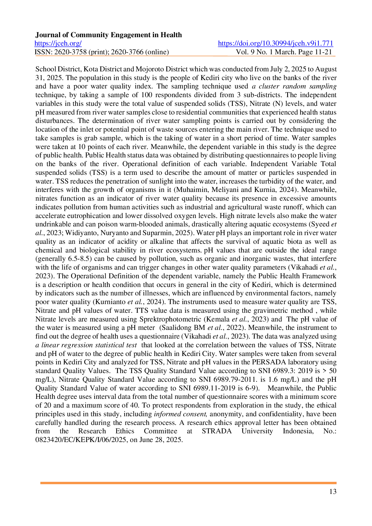 Journal of Community Engagement in HealthJournal of Community Engagement in HealthKualitas air yang buruk dapat berdampak signifikan terhadap derajat kesehatan masyarakat. Parameter TSS (Total Suspended Solid), Nitrat (N), dan pH merupakan indikator penting dalam menentukan kualitas air. Penelitian ini bertujuan untuk menganalisis efek kualitas air berdasarkan nilai TSS, Nitrat, dan pH terhadap derajat kesehatan masyarakat di Kota Kediri. Penelitian ini menggunakan desain penelitian kuantitatif observasional dengan pendekatan cross-sectional. Sampel penelitian berjumlah 100 responden dengan teknik sampling cluster random yang mencakup 3 kecamatan di Kota Kediri. Metode analisis data menggunakan uji regresi linier yang melihat korelasi antara nilai TSS, Nitrat, dan pH terhadap derajat kesehatan berdasarkan kualitas air masyarakat di Kota Kediri. Sampel air diambil dari beberapa titik sungai di Kota Kediri dan dianalisis di laboratorium PERSADA. Data nilai TSS diukur menggunakan metode gravimetri, nilai Nitrat diukur menggunakan spektrofotometri, sedangkan nilai pH diukur menggunakan pH meter. Hasil menunjukkan bahwa nilai rata-rata TSS ± 29,6 mg/L (Nilai Standar Kualitas sesuai SNI 6989.3:2019 adalah > 50 mg/L), nilai rata-rata Nitrat (N) adalah 1,24 mg/L (Nilai Standar Kualitas sesuai SNI 6989.79-2011 adalah 1,6 mg/L), dan nilai rata-rata pH ± 7,39 (Nilai Standar Kualitas sesuai SNI 6989.11-2019 adalah 6-9). Untuk nilai rata-rata derajat kesehatan berdasarkan kualitas air masyarakat Kota Kediri, rata-rata ± 30,3 (Nilai maksimal 40). Dari hasil analisis statistik menggunakan regresi linier, diperoleh data nilai p TSS = 0,02, nilai p Nitrat = 0,876, dan nilai p pH = 0,655 (sig. ≤ 0,05). Sehingga dapat disimpulkan bahwa nilai TSS memiliki efek signifikan terhadap status kesehatan masyarakat Kota Kediri. Sedangkan nilai Nitrat dan pH air tidak berpengaruh terhadap derajat kesehatan masyarakat Kota Kediri. Hasil penelitian menunjukkan bahwa nilai TSS, Nitrat, dan pH air di Kota Kediri masih memenuhi Standar Kualitas yang ditetapkan. Nilai TSS berpengaruh terhadap kesehatan masyarakat Kota Kediri. Namun, nilai Nitrat dan pH air tidak berpengaruh terhadap derajat kesehatan masyarakat di Kota Kediri.