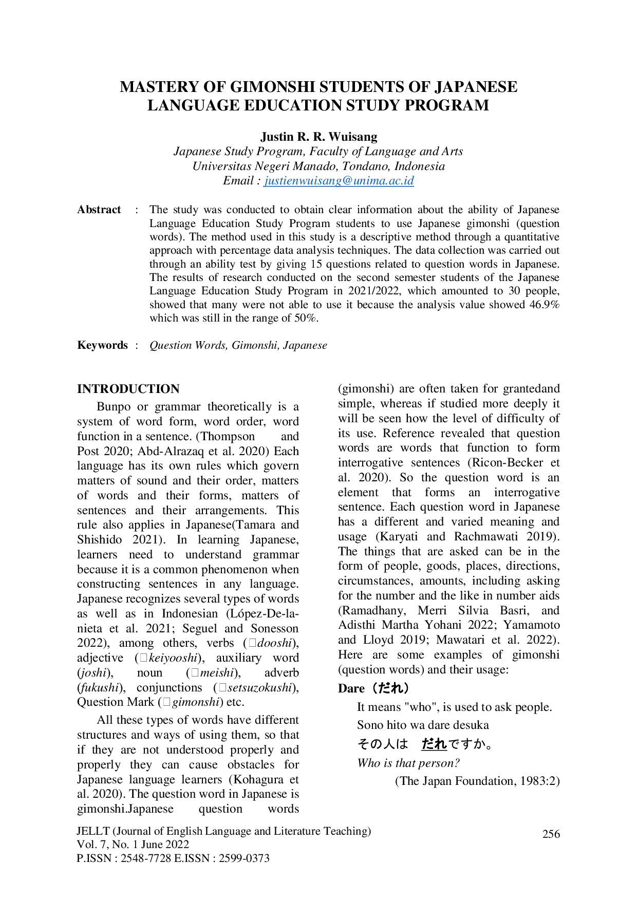 Journal of English Language and Literature TeachingJournal of English Language and Literature TeachingPenelitian ini dilakukan untuk memperoleh informasi yang jelas mengenai kemampuan mahasiswa Program Studi Pendidikan Bahasa Jepang dalam menggunakan gimonshi (kata tanya) bahasa Jepang. Metode yang digunakan dalam penelitian ini adalah metode deskriptif melalui pendekatan kuantitatif dengan teknik analisis data persentase. Pengumpulan data dilakukan melalui tes kemampuan dengan memberikan 15 soal terkait kata tanya dalam bahasa Jepang. Hasil penelitian yang dilakukan terhadap mahasiswa semester dua Program Studi Pendidikan Bahasa Jepang tahun ajaran 2021/2022 yang berjumlah 30 orang menunjukkan bahwa banyak yang belum mampu menggunakannya karena nilai analisis menunjukkan 46,9% yang masih berada di bawah kisaran 50%.