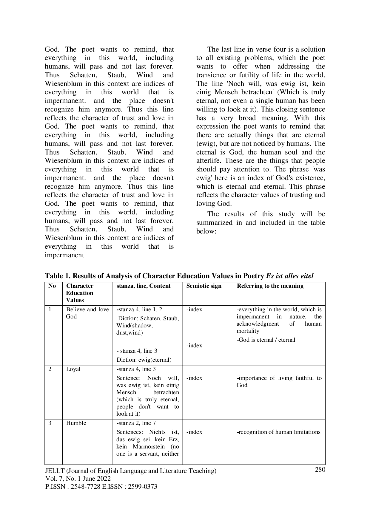 Journal of English Language and Literature TeachingJournal of English Language and Literature TeachingThis study aims to describe the values of character education contained in the poem Es ist Alle Eitel, the work of a German writer named Andreas Gryphius. This study uses a qualitative approach with content analysis method based on semiotic analysis, in this case semiotic analysis based on the semiotic theory of Charles Sanders Pierce. The results of the analysis show that in this poem there are semiotic signs in the form of indexes and symbols, which reflect the values of character education. The index sign is found more than the symbol sign. While the icon sign is not found in this poem. Furthermore, the character education values contained in this poem are the character of believing and loving God, sincere faithful, humble, empathetic, intelligent responsibility and love for the environment. The results showed that in this poem there are semiotic signs in the form of indexes and symbols, which are used as a means to express the values of character education, and are dominated by indexical signs. The iconic sign is not found in this poem. The results of this study are of course limited and cannot be generalized as the same findings and accepted by all readers/researchers of this poem. The results of this study, of course, will only serve as a comparison for further research, if anyone will examine this poem.