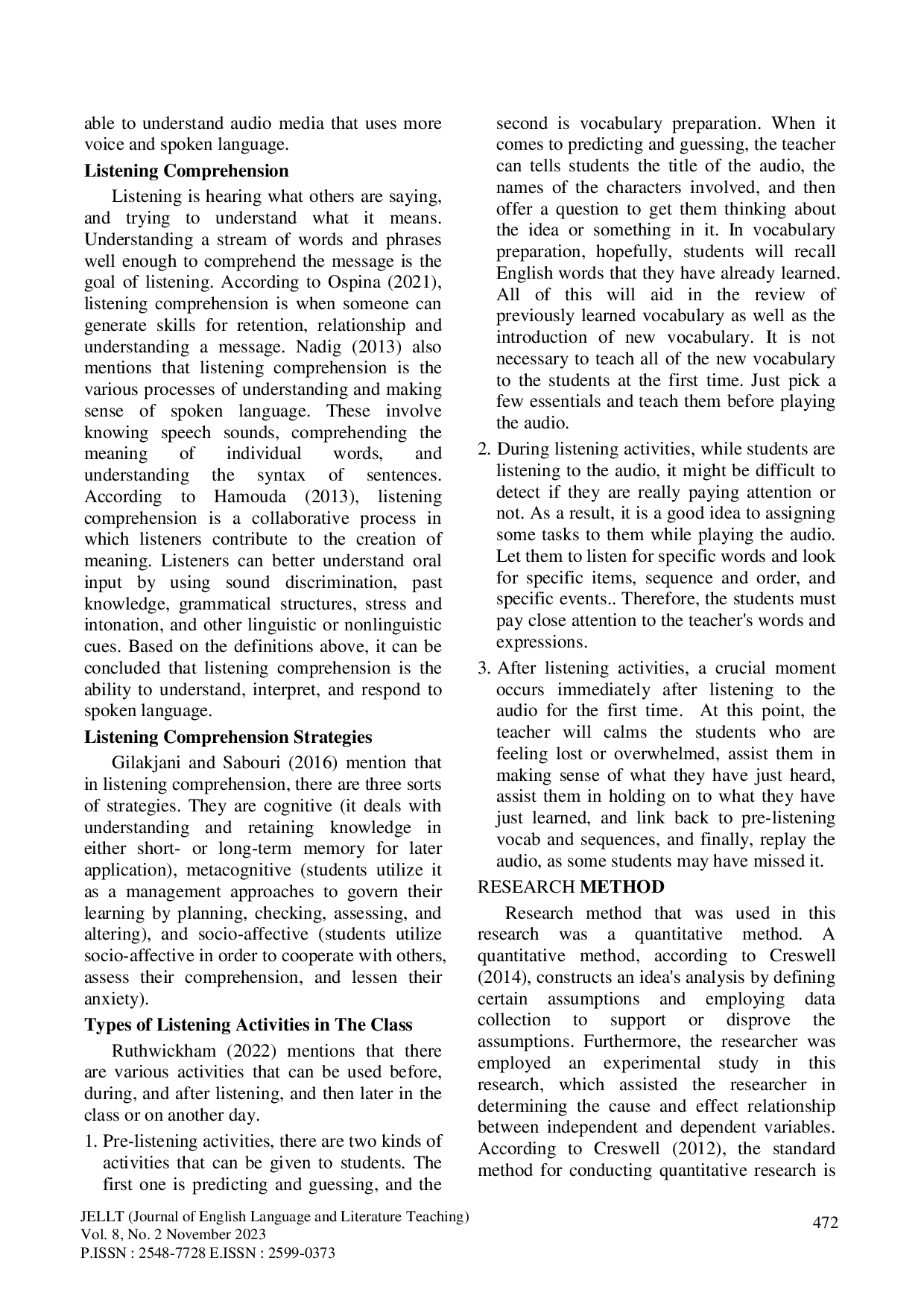 Journal of English Language and Literature TeachingJournal of English Language and Literature TeachingDalam upaya mengembangkan keterampilan mendengarkan, terdapat berbagai jenis media yang dapat digunakan, termasuk CD, perekam pita, audio, video, dan lain-lain. Namun, peneliti memilih audio sebagai media dalam pembelajaran. Oleh karena itu, tujuan penelitian ini adalah untuk mengetahui apakah terdapat peningkatan yang signifikan pada pencapaian pemahaman mendengarkan siswa setelah diajarkan dengan menggunakan audio. Tujuan lainnya adalah untuk mengetahui apakah terdapat perbedaan rata-rata yang signifikan antara siswa yang diajarkan dengan menggunakan audio dan mereka yang tidak. Metode penelitian yang digunakan adalah kuantitatif. Selain itu, peneliti menerapkan studi eksperimental. Sebagai desain, peneliti menggunakan studi quasi-eksperimental. Populasi penelitian ini adalah seluruh siswa kelas dua SMP Negeri 38 Palembang. Oleh karena itu, peneliti mengambil kelas VIII.3 (eksperimental) dan kelas VIII.7 (kontrol) sebagai sampel. Peneliti menggunakan tes isian, benar-salah, pilihan ganda, mencocokkan jawaban, urutan, dan mencocokkan frasa sebagai instrumen utama untuk mengumpulkan data. Peneliti menggunakan rumus T-Test Sampel Berpasangan dan Sampel Bebas untuk menghitung data. Terkait dengan efek penggunaan audio sebagai metode alternatif dalam meningkatkan pencapaian pemahaman mendengarkan siswa, hasil T-Test Sampel Berpasangan menunjukkan bahwa penggunaan audio sebagai metode alternatif memiliki efek positif. Menurut hasil T-Test Sampel Bebas, terdapat perbedaan yang signifikan antara skor post-test kelas kontrol dan kelas eksperimental. Dapat disimpulkan bahwa audio memberikan efek positif pada pencapaian pemahaman mendengarkan siswa SMP Negeri 38 Palembang.