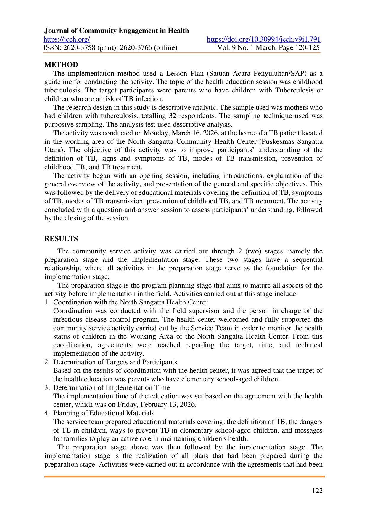 Journal of Community Engagement in HealthJournal of Community Engagement in HealthTuberkulosis (Tb) tetap menjadi masalah kesehatan masyarakat yang serius di Indonesia dengan angka penularan yang tinggi. Anak-anak memiliki risiko lebih tinggi terhadap Tb menyebar dan penyakit ekstrapulmoner dibandingkan orang dewasa. Tujuan dari kegiatan pengabdian masyarakat ini adalah untuk mengetahui efektivitas edukasi tuberkulosis anak melalui media leaflet dalam meningkatkan pengetahuan orang tua di wilayah kerja Puskesmas Sangatta Utara. Metode pelaksanaan yang digunakan adalah analisis deskriptif. Kegiatan pengabdian masyarakat, berupa edukasi pentingnya peningkatan pengetahuan (edukasi) tentang pencegahan tuberkulosis pada anak melalui media leaflet selama kunjungan rumah untuk meningkatkan pengetahuan orang tua, dilaksanakan pada Senin, 16 Maret 2026. Kegiatan konseling dilakukan di rumah masing-masing peserta. Simpulan: Kegiatan edukasi tuberkulosis anak dapat meningkatkan pengetahuan orang tua di Puskesmas Sangatta Utara. Pemberdayaan tenaga kesehatan dan kader dalam meningkatkan edukasi tuberkulosis anak diharapkan dapat terwujud secara efektif melalui kegiatan konseling ini.
