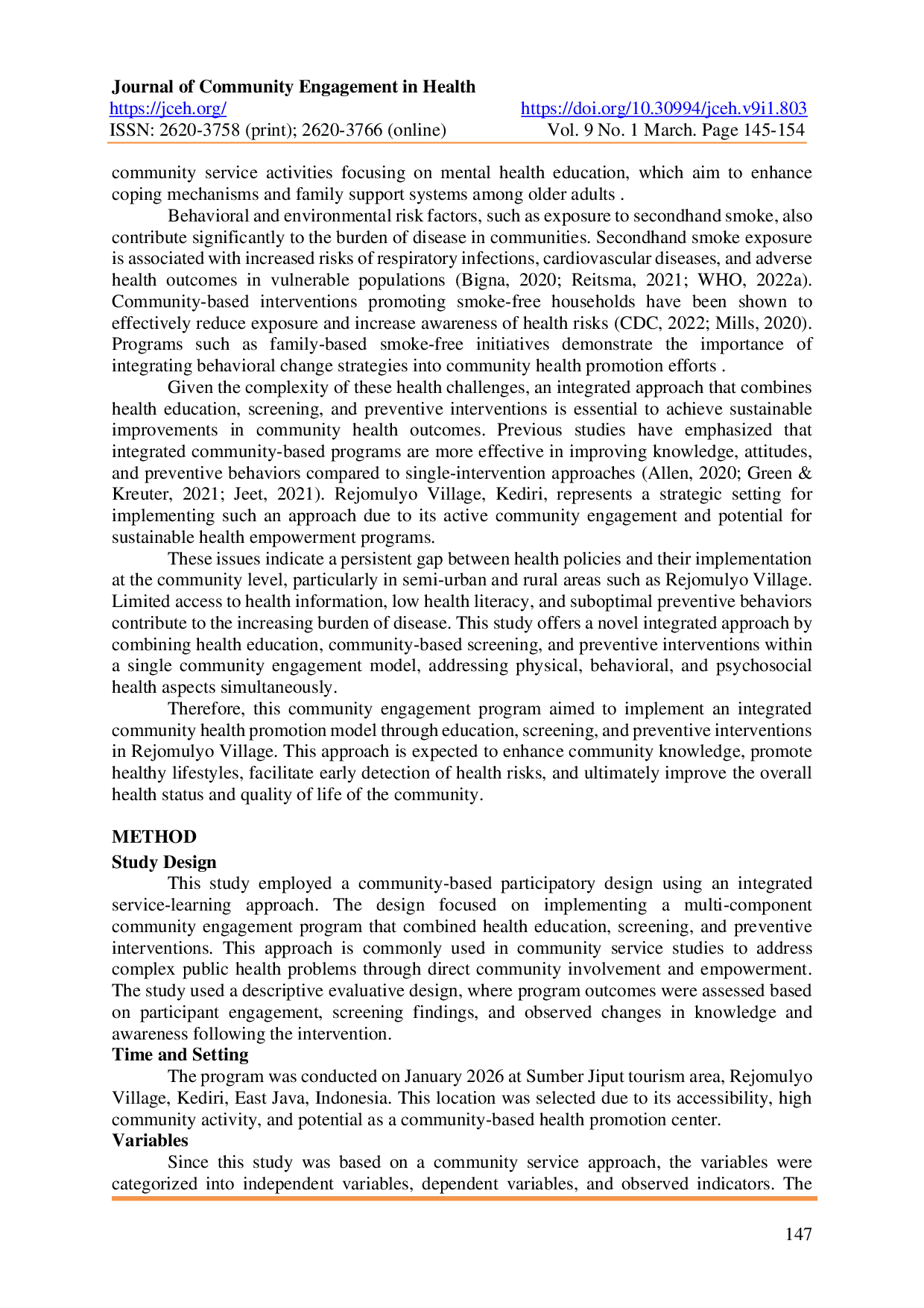 Journal of Community Engagement in HealthJournal of Community Engagement in HealthMasalah kesehatan masyarakat di Indonesia semakin kompleks, termasuk beban penyakit tidak menular, penyakit menular, masalah gizi, dan masalah psikososial, khususnya di kalangan populasi rentan seperti lansia. Layanan masyarakat ini bertujuan untuk menerapkan program promosi kesehatan masyarakat terpadu melalui pendidikan, skrining, dan intervensi pencegahan di Desa Rejomulyo, Kediri. Studi ini menggunakan pendekatan partisipatif berbasis masyarakat dengan desain evaluatif deskriptif. Program ini melibatkan sekitar 65 peserta dan mencakup sesi pendidikan kesehatan, skrining kesehatan (tanda vital, antropometri, tes biokimia, dan penilaian fungsi fisik), serta intervensi pencegahan seperti pemberian makan tambahan berbasis makanan lokal dan promosi rumah bebas asap rokok. Data dikumpulkan melalui observasi, catatan skrining, dan respons peserta, dan dianalisis secara deskriptif. Hasil menunjukkan bahwa proporsi signifikan peserta berisiko terkena penyakit tidak menular, termasuk hipertensi, gula darah tinggi, dan status gizi abnormal. Kegiatan pendidikan kesehatan meningkatkan pengetahuan dan kesadaran peserta tentang pencegahan penyakit, perilaku hidup bersih dan sehat, serta risiko kesehatan lingkungan. Intervensi pencegahan diterima dengan baik, dengan peningkatan komitmen masyarakat untuk mengadopsi gaya hidup yang lebih sehat, termasuk pemantauan kesehatan rutin dan praktik rumah bebas asap rokok. Kesimpulannya, pendekatan terpadu yang menggabungkan pendidikan, skrining, dan intervensi pencegahan terbukti efektif dalam meningkatkan kesadaran masyarakat, memungkinkan deteksi dini risiko kesehatan, dan mempromosikan perilaku kesehatan berkelanjutan. Model ini memiliki potensi untuk diadaptasi di komunitas lain untuk meningkatkan hasil kesehatan masyarakat.
