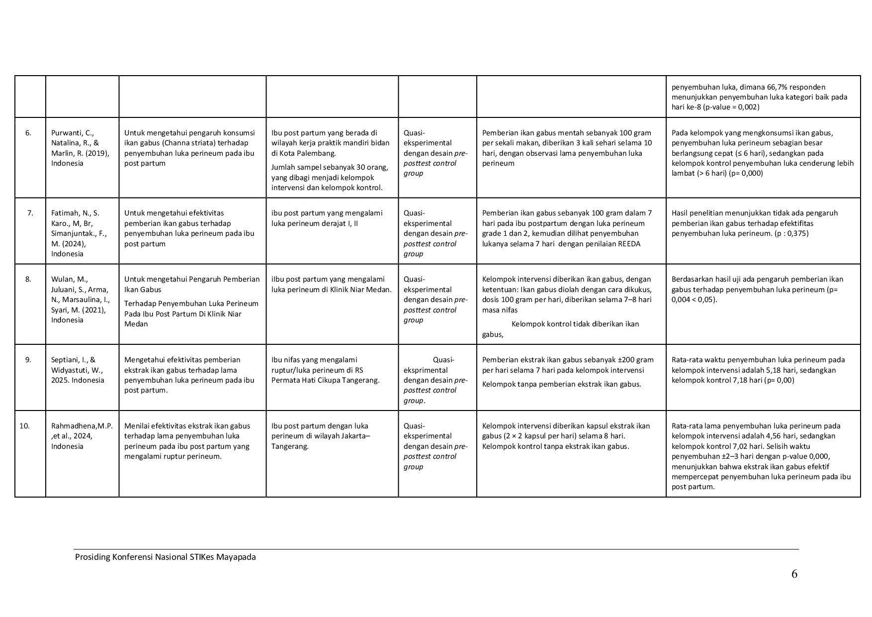 Prosiding Konferensi Nasional STIKes MayapadaProsiding Konferensi Nasional STIKes MayapadaLatar Belakang. Luka perineum merupakan salah satu masalah pada persalinan pervaginam yang dapat memengaruhi kenyamanan, meningkatkan risiko infeksi, serta memperlambat proses pemulihan pada masa postpartum. Penyembuhan luka perineum dipengaruhi oleh berbagai faktor, salah satunya adalah kecukupan nutrisi, terutama protein dan albumin yang berperan penting dalam regenerasi jaringan dan sintesis kolagen. Ikan gabus (Channa striata) dikenal sebagai sumber protein dan albumin tinggi serta secara tradisional banyak dimanfaatkan di Indonesia untuk membantu pemulihan luka. Tujuan: Penelitian bertujuan untuk memetakan dan mensintesis bukti ilmiah terkait efektivitas konsumsi ikan gabus terhadap percepatan penyembuhan luka perineum pada ibu postpartum. Metode: Desain penelitian scoping review dengan pendekatan rapid evidence review menggunakan pedoman PRISMA-ScR. Pencarian literatur dilakukan melalui data base PubMed, EBSCO, dan search engine Google Scholar untuk artikel yang dipublikasikan pada periode 2015–2025. Kriteria inklusi meliputi penelitian primer pada ibu postpartum dengan luka perineum, intervensi berupa konsumsi ikan gabus atau ekstraknya, serta luaran penyembuhan luka. Data dianalisis secara deskriptif dan disintesis secara naratif. Hasil: Hasil penelitian diperoleh 10 artikel eligible. Mayoritas studi menunjukkan bahwa konsumsi ikan gabus dapat mempercepat penyembuhan luka perineum dibandingkan kelompok kontrol, dengan penurunan waktu penyembuhan sekitar 2–3 hari serta perbaikan skor REEDA. Satu studi melaporkan hasil tidak signifikan, yang diduga dipengaruhi oleh durasi intervensi yang singkat dan keterbatasan metodologis. Kesimpulan: Konsumsi ikan gabus efektif dalam mempercepat penyembuhan luka perineum pada ibu postpartum dan berpotensi menjadi intervensi nutrisi komplementer yang aman, terjangkau, dan sesuai dengan budaya lokal. Penelitian lanjutan dengan desain uji acak terkontrol masih diperlukan untuk memperkuat bukti ilmiah.