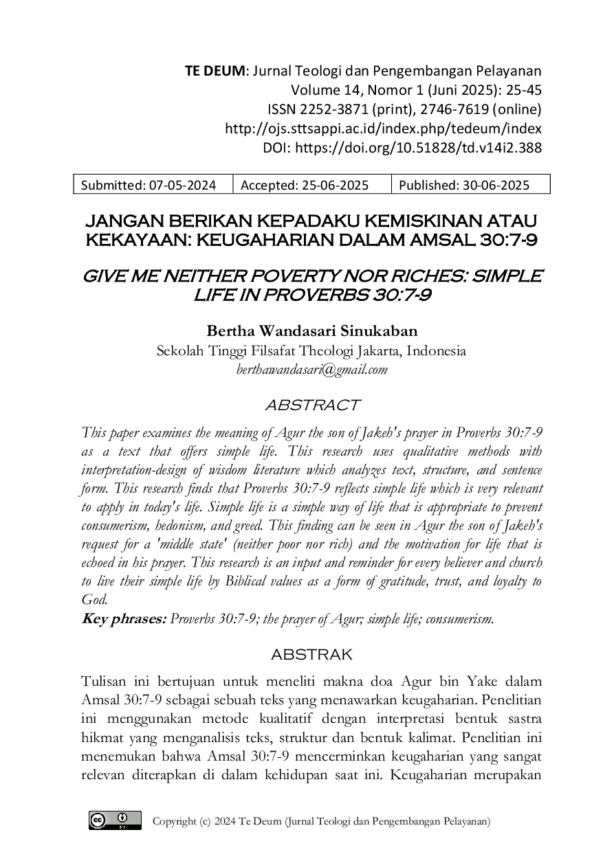 http://ojs.sttsappi.ac.id/index.php/tedeum/indexhttp://ojs.sttsappi.ac.id/index.php/tedeum/indexTulisan ini bertujuan untuk meneliti makna doa Agur bin Yake dalam Amsal 30:7-9 sebagai sebuah teks yang menawarkan keugaharian. Penelitian ini menggunakan metode kualitatif dengan interpretasi bentuk sastra hikmat yang menganalisis teks, struktur dan bentuk kalimat. Penelitian ini menemukan bahwa Amsal 30:7-9 mencerminkan keugaharian yang sangat relevan diterapkan dalam kehidupan saat ini. Keugaharian merupakan cara hidup sederhana yang tepat untuk menghalangi konsumerisme, hedonisme dan keserakahan. Temuan ini tampak dalam permohonan Agur bin Yake yang meminta keadaan pertengahan (tidak miskin dan tidak kaya) dan motivasi hidup ugahari yang digemakan dalam doanya. Penelitian ini menjadi masukan dan pengingat bagi setiap orang percaya dan gereja agar hidup ugahari sesuai dengan nilai-nilai Alkitabiah sebagai bentuk ucapan syukur, kepercayaan dan kesetiaannya kepada Tuhan.