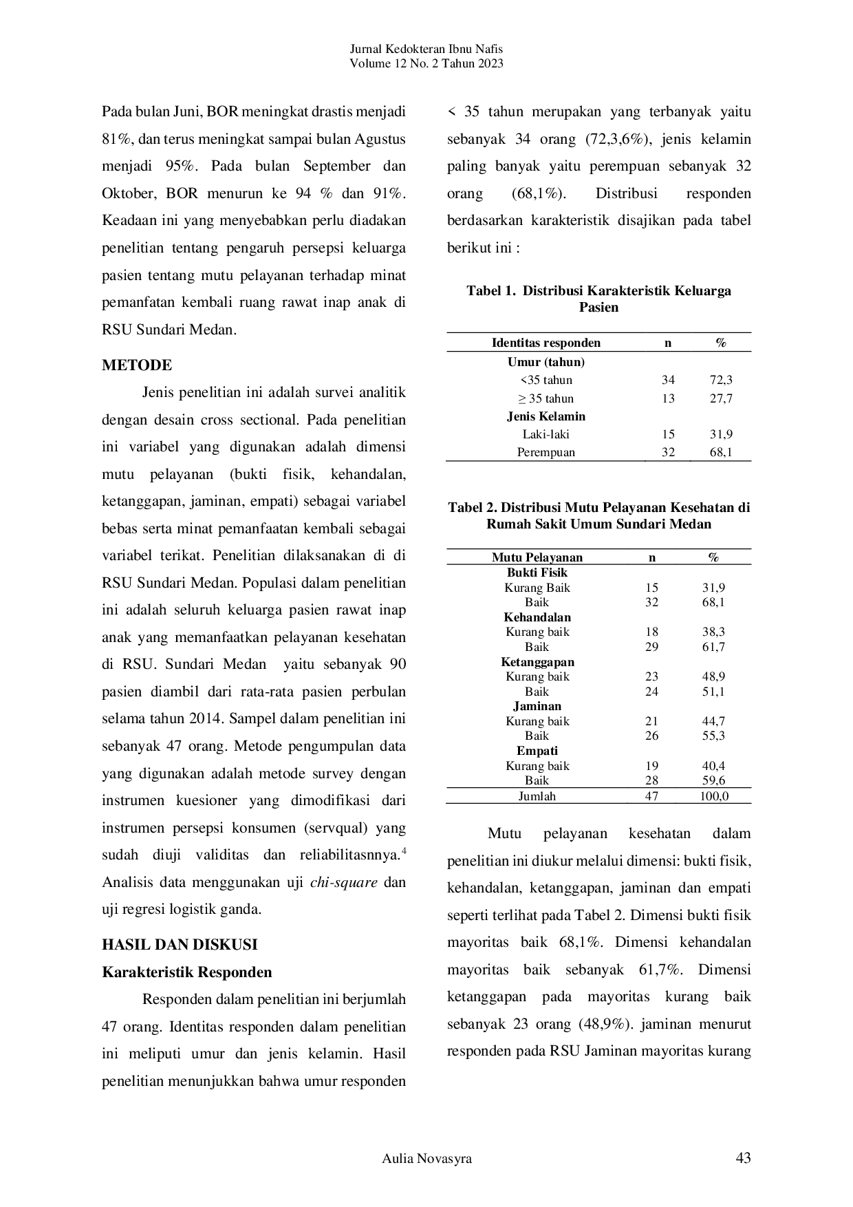 Jurnal Kedokteran Ibnu NafisJurnal Kedokteran Ibnu NafisKeluarga berperan penting dalam menentukan rumah sakit untuk merawat anaknya. Persepsi yang tidak baik mengenai mutu pelayanan rumah sakit akan mengurangi penggunaan kembali pelayanan rumah sakit. Penelitian ini bertujuan menganalisis pengaruh persepsi keluarga pasien terhadap minat pemanfaatan kembali ruang rawat inap anak di Rumah Sakit Sundari Medan. Metode yang digunakan adalah deskriptif analitik, dengan desain cross-sectional. Populasi adalah rerata keluarga pasien rawat inap anak yang memanfaatkan pelayanan kesehatan di RSU Sundari Medan tahun 2014 dengan sampel berjumlah 47 orang. Metode pengumpulan data yang digunakan adalah metode survey dengan instrumen kuesioner. Analisa data dilakukan dengan Chi Square dan uji regresi logistik ganda. Hasil penelitian menunjukkan bahwa dimensi ketanggapan (p=0,016) nilai OR=6,434 dan empati (p=0,027) nilai OR=5,443 adalah yang paling mempengaruhi minat pemanfaatan kembali ruang rawat inap anak. Dimensi ketanggapan adalah yang paling berpengaruh terhadap minat memanfaatkan kembali fasilitas ruang rawat inap anak dengan kemungkinan 6,434 kali lipat lebih banyak untuk kembali memanfaatkan ruang rawat inap anak.