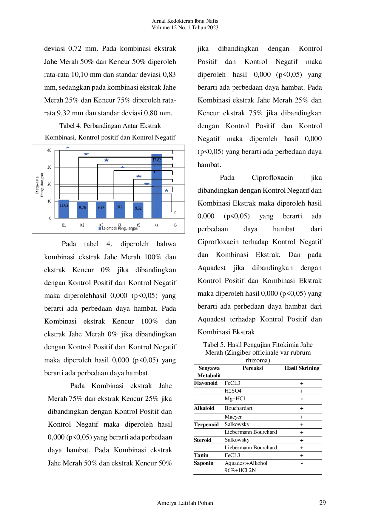 Kombinasi ekstrak Jahe Merah (Zingiber officinale var rubrum) dan ekstrak Kencur (Kaempferia galanga L.) memiliki efek menghambat bakteri >10 mm terhadap pertumbuhan bakteri Staphylococcus aureus.Kombinasi ekstrak Jahe Merah (Zingiber officinale var rubrum) dan ekstrak Kencur (Kaempferia galanga L.) dapat menghambat pertumbuhan bakteri Staphylococcus aureus pada kelompok kombinasi K1 dan K4.Hasil penelitian ini menunjukkan potensi ekstrak jahe merah dan kencur sebagai antibiotik pendamping.