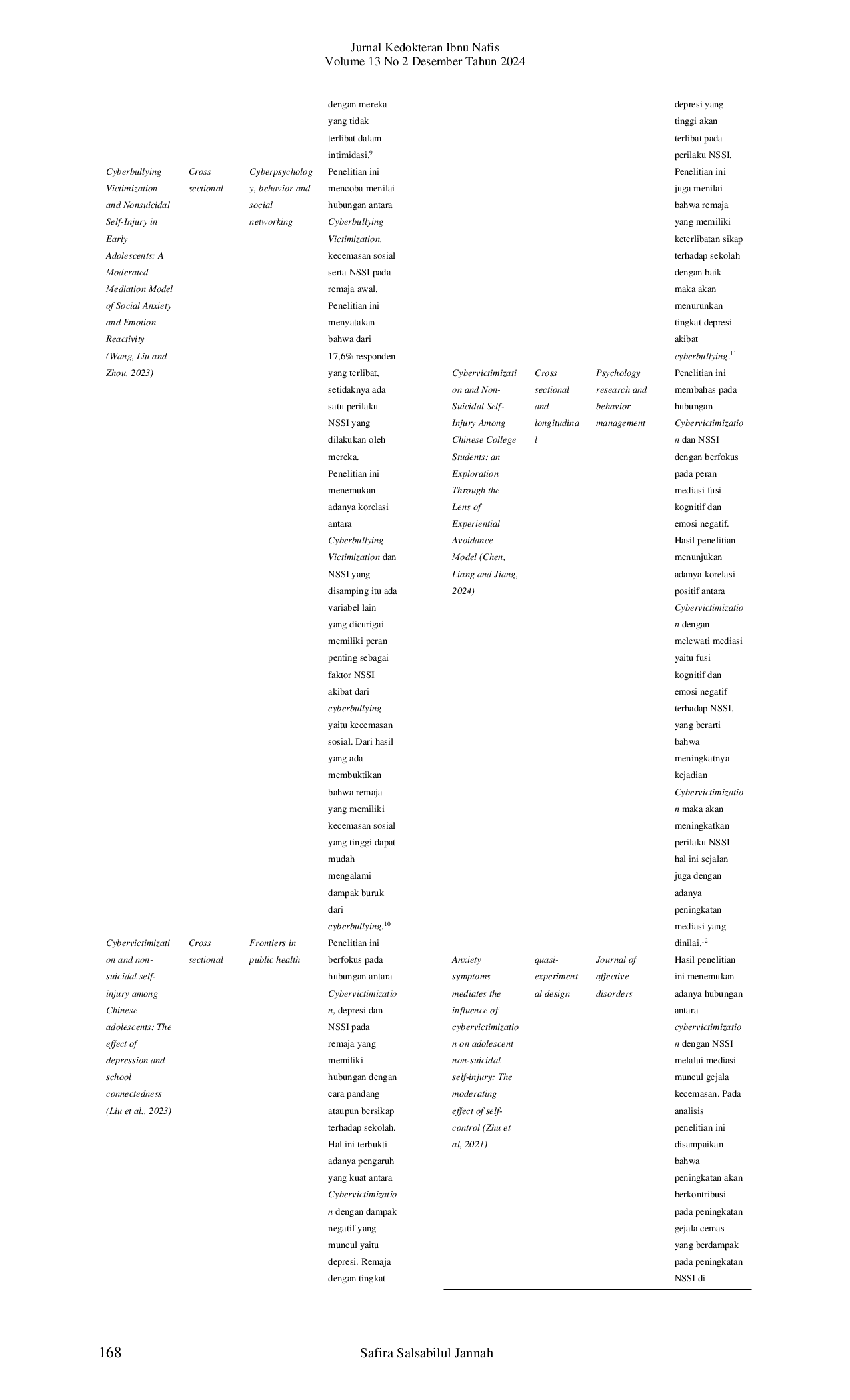 Jurnal Kedokteran Ibnu NafisJurnal Kedokteran Ibnu NafisPerbuatan yang tak jarang ditemukan dan dapat mengancam nyawa di era modern ini adalah cyberbullying. Hal ini dikarenakan tekanan yang didapatkan dari tindakan cyberbullying yang membuat seseorang merasa tidak nyaman dengan dirinya. Seseorang yang mengalami cyberbullying cenderung tidak percaya diri sehingga mudah sekali untuk terprovokasi oleh hal negatif salah satunya dengan melakukan Nonsuicidal self injury. Metode yang dipilih untuk penelitian ini adalah systematic literature review dengan menggunakan PRISMA sebagai alat untuk panduan penilaian artikel. Jumlah artikel akhir yang sesuai dengan kriteria inklusi sejumlah 8 artikel. Pada hasil tinjauan sistematis yang telah dilakukan bahwa semua penelitian tersebut menyatakan terdapat korelasi positif antara cyberbullying atau cybervictimization dengan NSSI. Hal ini sejalan dengan dampak yang dipaparkan pada beberapa penelitian bahwa faktor penyebab paling sering orang melakukan NSSI adalah disebabkan karena adanya perilaku dan tekanan dari cyberbullying atau cybervictimization. Penelitian lain juga mendukung dan dibuktikan bahwa terdapat korelasi positif antara cyberbullying dengan NSSI pada remaja.
