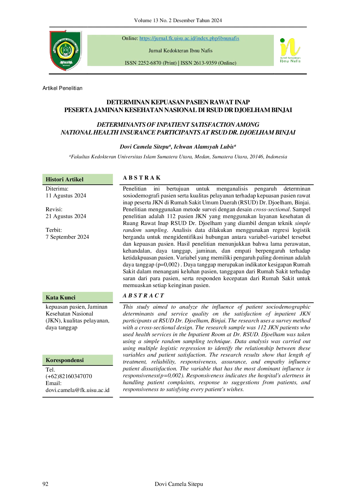 Jurnal Kedokteran Ibnu NafisJurnal Kedokteran Ibnu NafisPenelitian ini bertujuan untuk menganalisis pengaruh determinan sosiodemografi pasien serta kualitas pelayanan terhadap kepuasan pasien rawat inap peserta JKN di Rumah Sakit Umum Daerah (RSUD) Dr. Djoelham, Binjai. Penelitian menggunakan metode survei dengan desain cross-sectional. Sampel penelitian adalah 112 pasien JKN yang menggunakan layanan kesehatan di Ruang Rawat Inap RSUD Dr. Djoelham yang diambil dengan teknik simple random sampling. Analisis data dilakukan menggunakan regresi logistik berganda untuk mengidentifikasi hubungan antara variabel-variabel tersebut dan kepuasan pasien. Hasil penelitian menunjukkan bahwa lama perawatan, kehandalan, daya tanggap, jaminan, dan empati berpengaruh terhadap ketidakpuasan pasien. Variabel yang memiliki pengaruh paling dominan adalah daya tanggap (p=0,002). Daya tanggap merupakan indikator kesigapan Rumah Sakit dalam menangani keluhan pasien, tanggapan dari Rumah Sakit terhadap saran dari para pasien, serta responden kecepatan dari Rumah Sakit untuk memuaskan setiap keinginan pasien.
