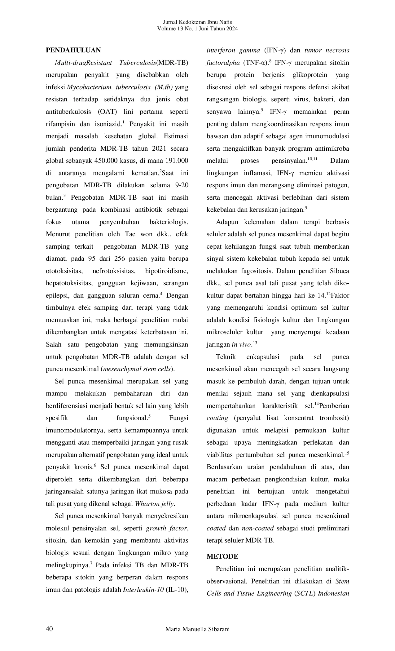 Jurnal Kedokteran Ibnu NafisJurnal Kedokteran Ibnu NafisSampai saat ini multi-drug resistant tuberculosis (MDR-TB) masih menjadi masalah kesehatan global. Fokus utama pengobatan MDR-TB bergantung pada kombinasi antibiotic sebagai terapi penyembuhan bakteriologis yang dapat menyebabkan beberapa efek samping yang merugikan. Penelitian menggunakan sel punca mesenkimal mulai dikembangkan sebagai bentuk terapi baru. Sel punca mesenkimal berfungsi sebagai imunomodulator dan mampu menyekresikan berbagai jenis sitokin, salah satunya IFN-γ. Pada MDR-TB, IFN-γ dapat meningkatkan respons imun seluler untuk mengaktifkan makrofag sebagai penghancur mikroba. Penelitian ini bertujuan untuk mengetahui perbedaan kadar IFN-γ pada medium kultur antara mikroenkapsulasi sel punca mesenkimal yang disalut (coated) dan tidak disalut (non-coated) lisat konsentrat trombosit sebagai studi preliminari terapi seluler MDR-TB. Penelitian ini merupakan penelitian analitik-observasional. Kadar IFN-γ diukur menggunakan spektrofotometer dengan panjang gelombang 450nm. Data yang didapat kemudian dianalisis menggunakan ujiMann-Whitney. Dari hasil penelitian diperoleh sekresi IFN-γ pada kelompok non-coated pada hari ke-2, ke-7, ke-14, dan ke-21 masing-masing sebanyak 0,018 pg/mL, 0,0616 pg/mL, 2,2735 pg/mL, dan 2,2735 pg/mL, sedangkan pada kelompok coated diperoleh data pada hari ke-2, ke-7, ke-14, dan ke-21 masing-masing sebanyak 0 pg/mL, 0 pg/mL, 0,0512 pg/mL, dan 1,7165 pg/mL. Hasil uji Mann-Whitney menunjukkan bahwa tidak terdapat perbedaan kadar IFN-γ pada medium kultur mikroenkapsulasi sel punca mesenkimal coated dan non- coated.