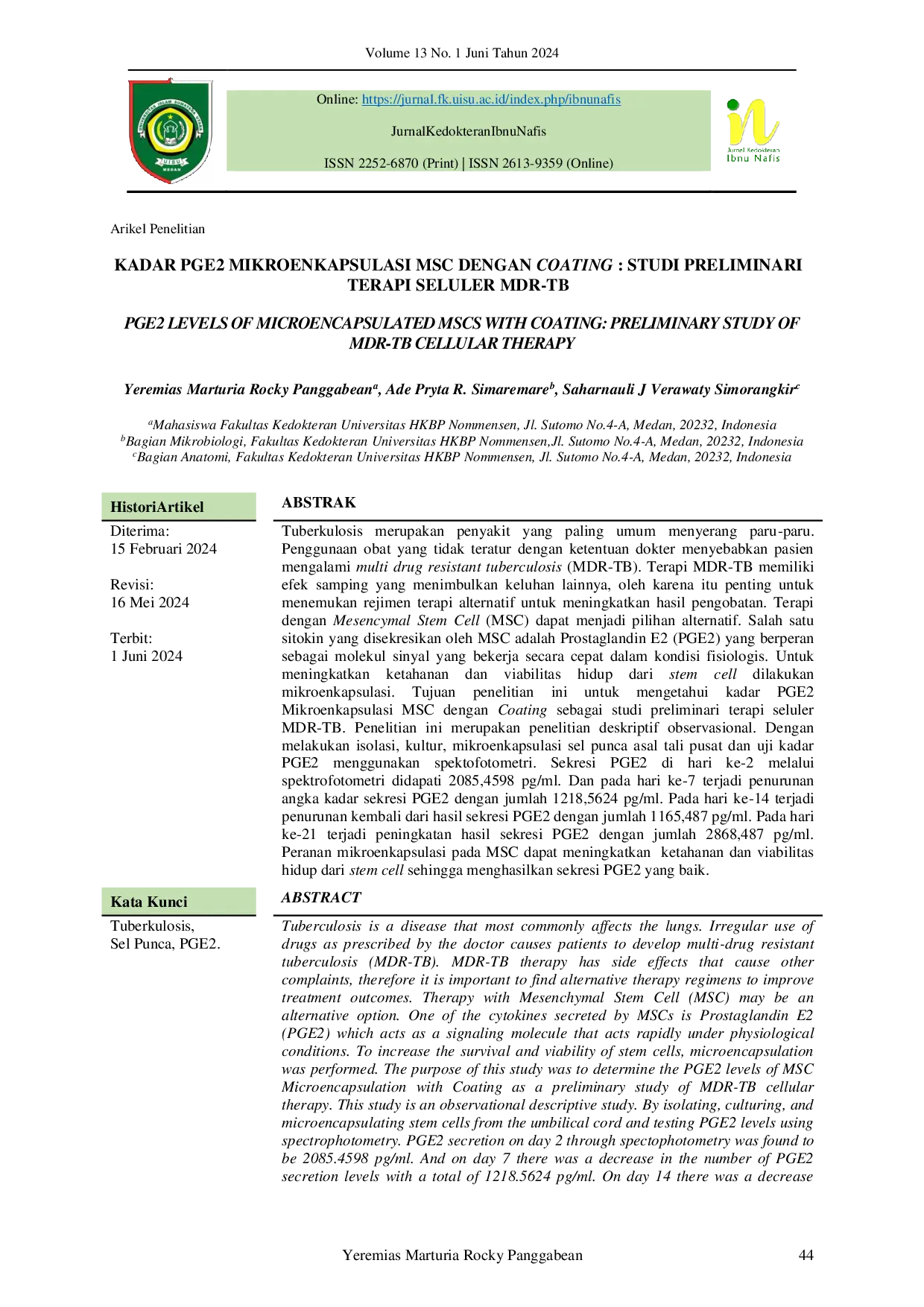 Jurnal Kedokteran Ibnu NafisJurnal Kedokteran Ibnu NafisTuberkulosis merupakan penyakit yang paling umum menyerang paru-paru. Penggunaan obat yang tidak teratur dengan ketentuan dokter menyebabkan pasien mengalami multi drug resistant tuberculosis (MDR-TB). Terapi MDR-TB memiliki efek samping yang menimbulkan keluhan lainnya, oleh karena itu penting untuk menemukan rejimen terapi alternatif untuk meningkatkan hasil pengobatan. Terapi dengan Mesencymal Stem Cell (MSC) dapat menjadi pilihan alternatif. Salah satu sitokin yang disekresikan oleh MSC adalah Prostaglandin E2 (PGE2) yang berperan sebagai molekul sinyal yang bekerja secara cepat dalam kondisi fisiologis. Untuk meningkatkan ketahanan dan viabilitas hidup dari stem cell dilakukan mikroenkapsulasi. Tujuan penelitian ini untuk mengetahui kadar PGE2 Mikroenkapsulasi MSC dengan Coating sebagai studi preliminari terapi seluler MDR-TB. Penelitian ini merupakan penelitian deskriptif observasional. Dengan melakukan isolasi, kultur, mikroenkapsulasi sel punca asal tali pusat dan uji kadar PGE2 menggunakan spektrofotometri. Sekresi PGE2 di hari ke-2 melalui spektrofotometri didapati 2085,4598 pg/ml. Dan pada hari ke-7 terjadi penurunan angka kadar sekresi PGE2 dengan jumlah 1218,5624 pg/ml. Pada hari ke-14 terjadi penurunan kembali dari hasil sekresi PGE2 dengan jumlah 1165,487 pg/ml. Pada hari ke-21 terjadi peningkatan hasil sekresi PGE2 dengan jumlah 2868,487 pg/ml. Peranan mikroenkapsulasi pada MSC dapat meningkatkan ketahanan dan viabilitas hidup dari stem cell sehingga menghasilkan sekresi PGE2 yang baik.